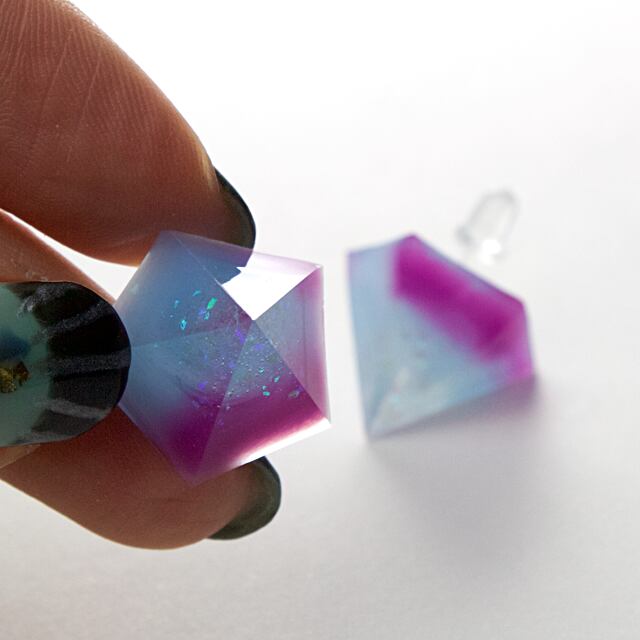 温度で色の変わるカラーとラメなどをクリスタルレジンで閉じ込めたピラミッドピアスです。