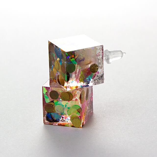様々な色の破片とゴールドの丸ラメをクリスタルレジンを用いて閉じ込めたキューブ型のピアスです。
