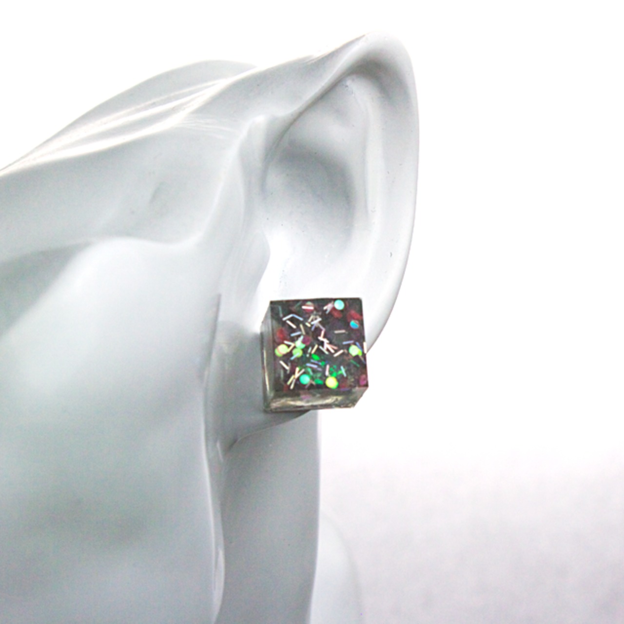 ブラックに様々な色の破片と丸ラメ、細長いラメなどをクリスタルレジンを用いて閉じ込めたキューブ型のピアスです。