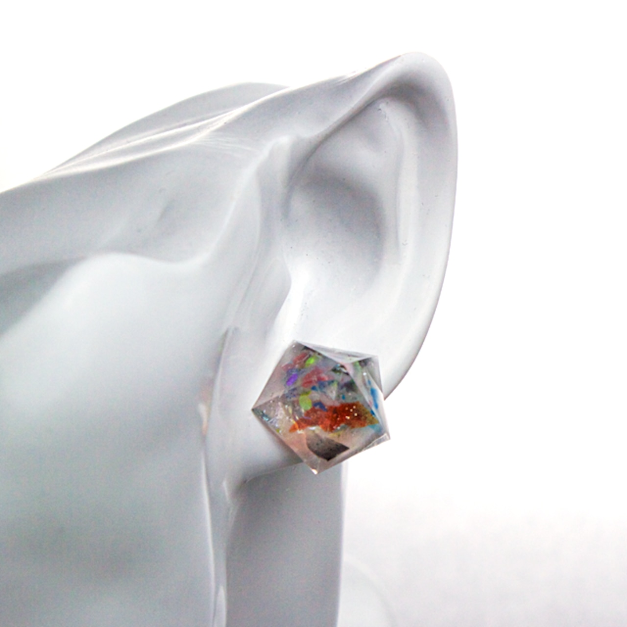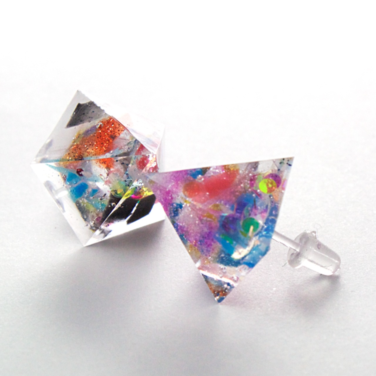 様々なカラーやラメなどをクリスタルレジンで閉じ込めたペンタゴン型のピアスです。