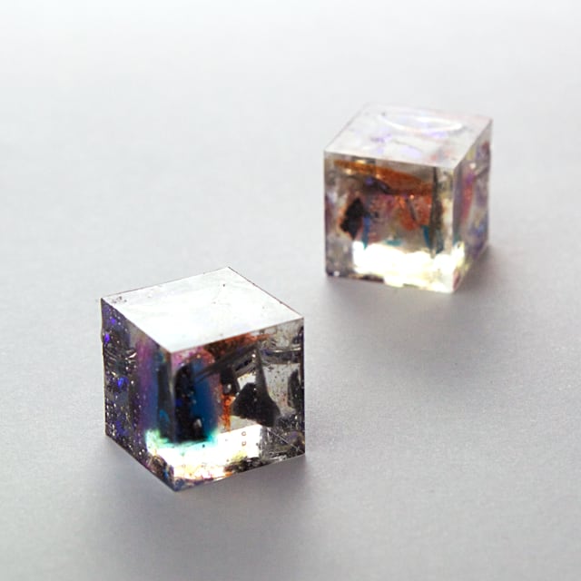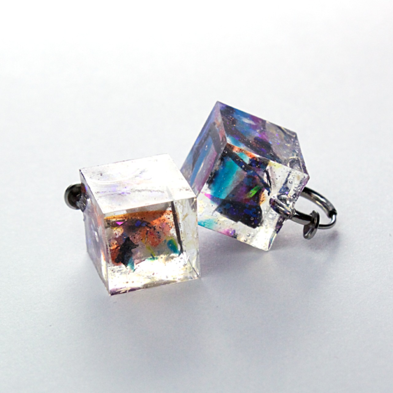 様々なカラーの破片と細かな煌めくラメをクリスタルレジンを用いて閉じ込めたキューブ型のイヤリングです。