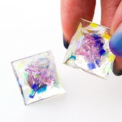 様々なカラーの欠片や丸ラメ、短冊ラメなどをクリスタルレジンで閉じ込めたピラミッド型のピアスです。