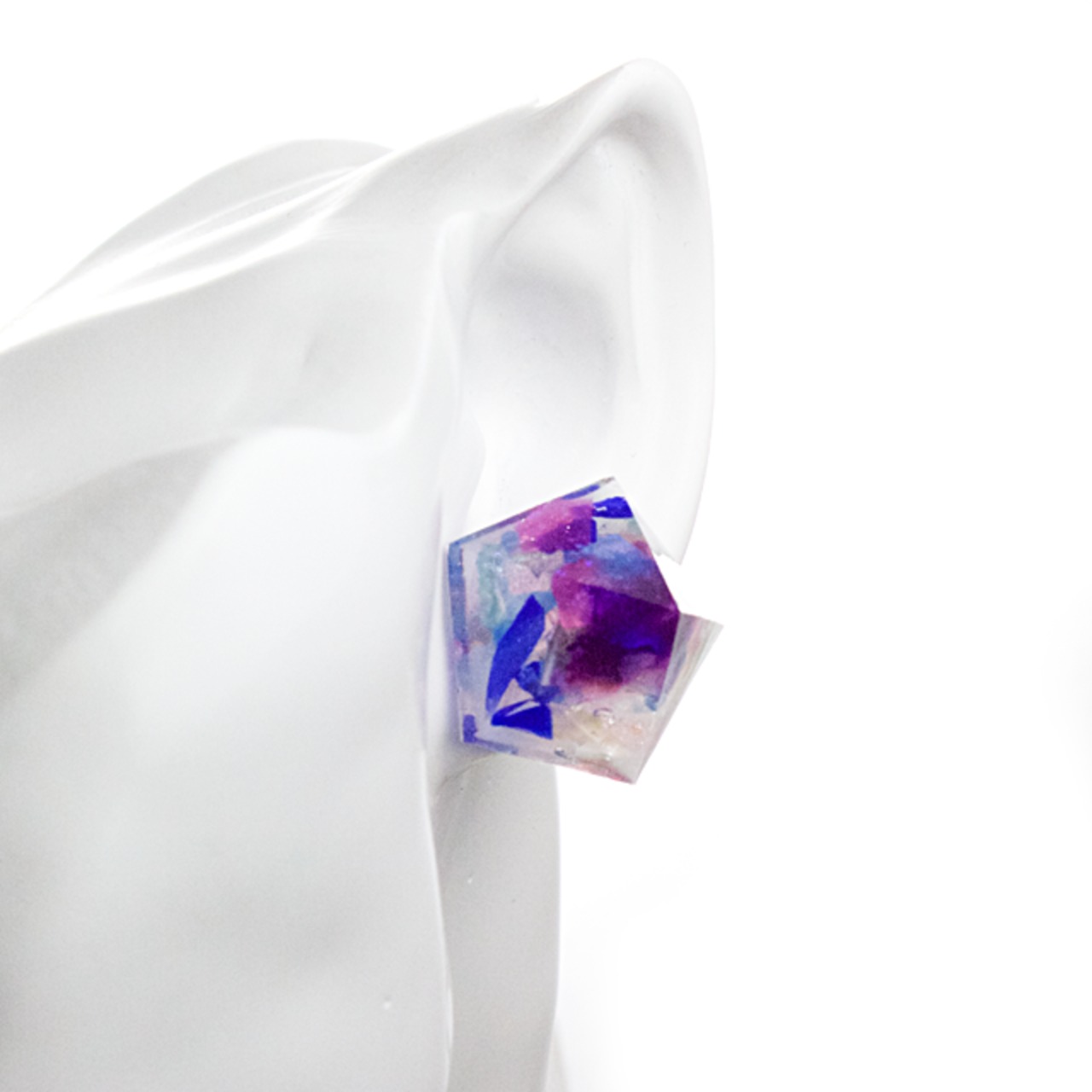 パープルと様々なカラーの破片をクリスタルレジンで閉じ込めたペンタゴン型のピアスです。