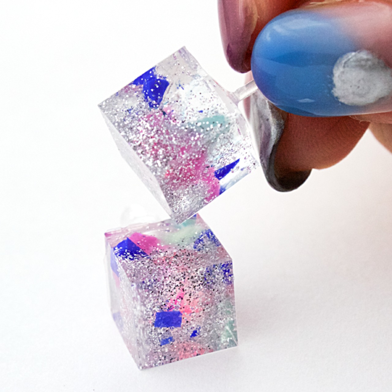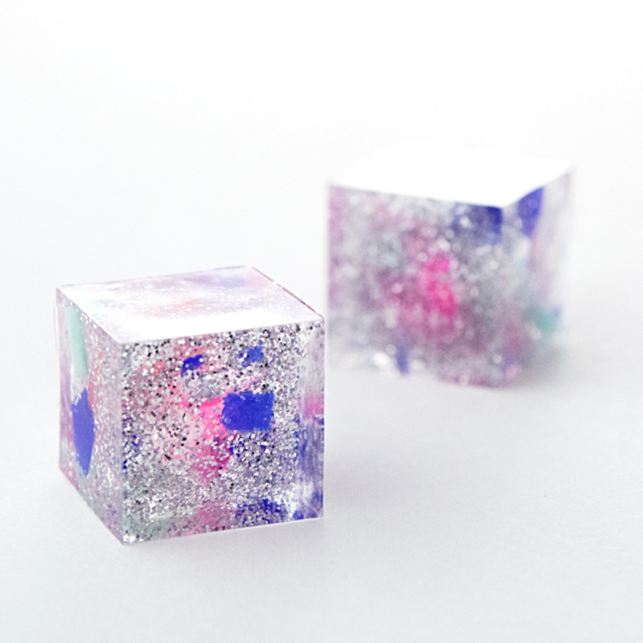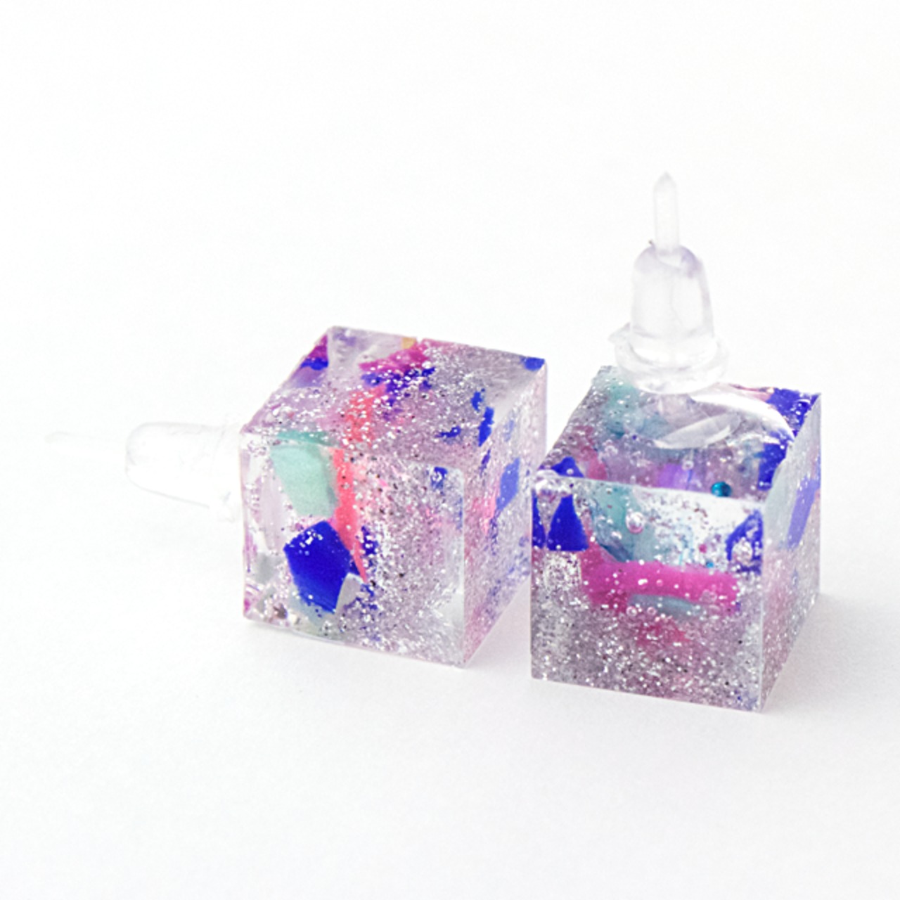 様々なカラーの破片とシルバーの細かなラメをクリスタルレジンで閉じ込めたキューブ型のピアスです。