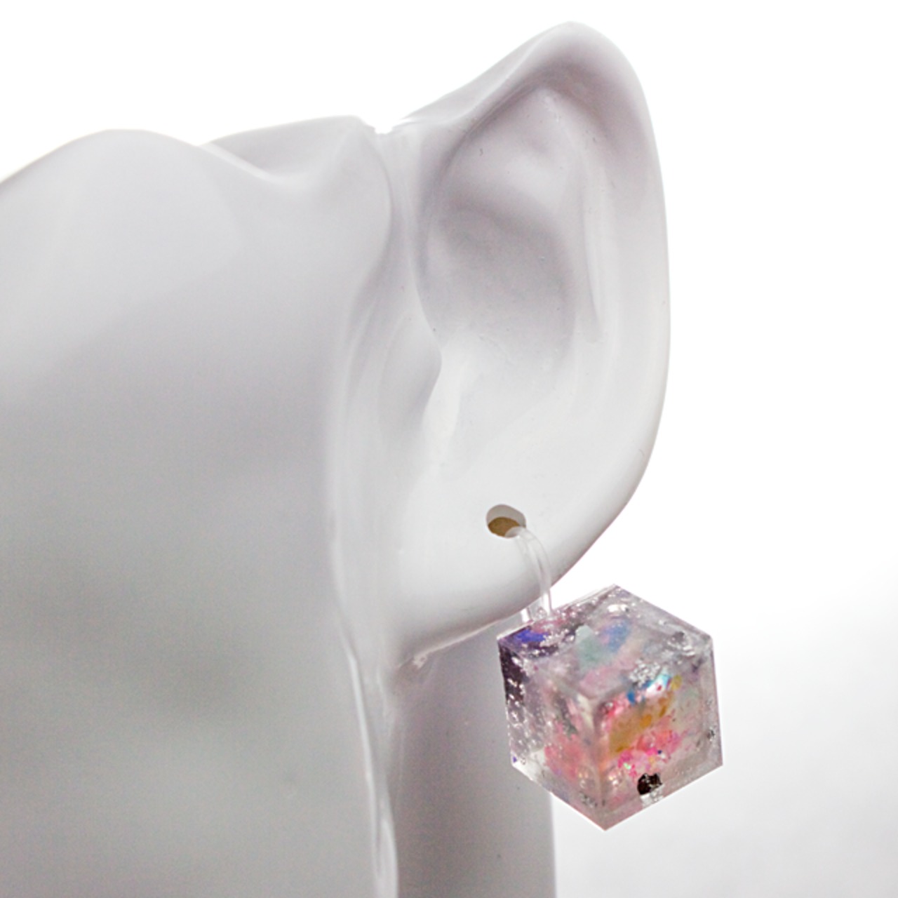 様々なカラーの破片とラメをクリスタルレジンを用いて閉じ込めたキューブ型のフックピアスです。