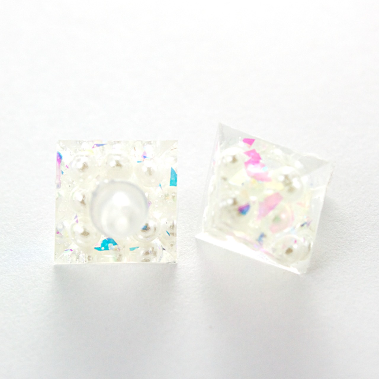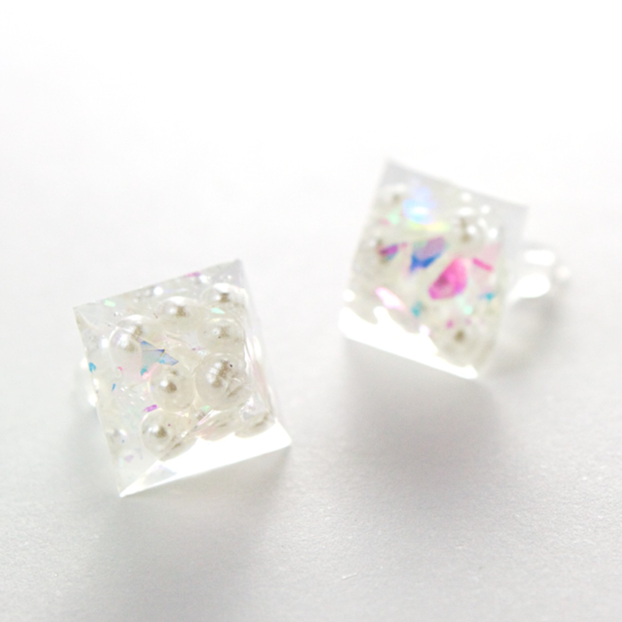 パールストーンと細かなオーロラを入れたクリスタルレジンのピラミッド型のピアスです。