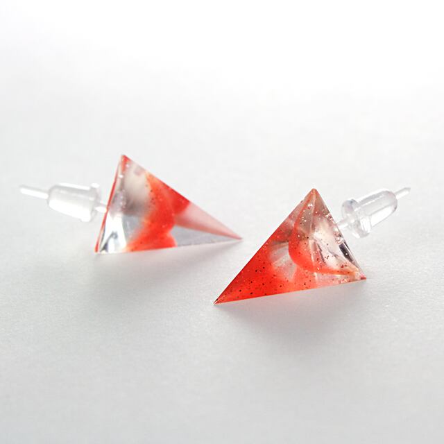 シンプルにオレンジのカラーとラメをクリスタルレジンで閉じ込めた三角錐型のピアスです。