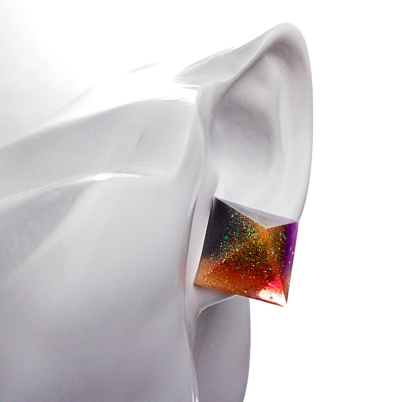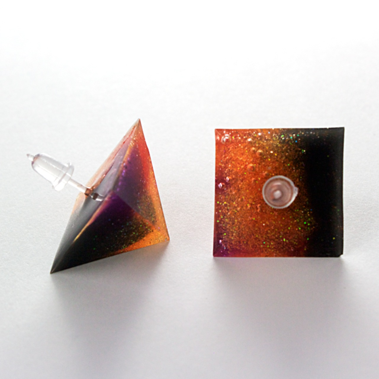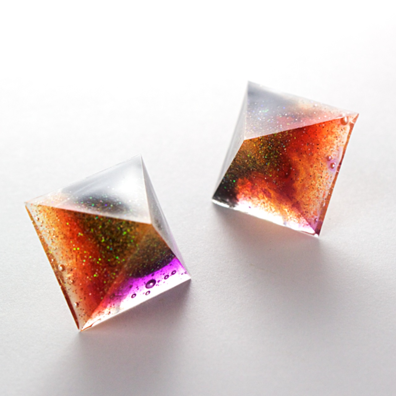 様々なカラーとラメをクリスタルレジンで閉じ込めたピラミッド型のピアスです。