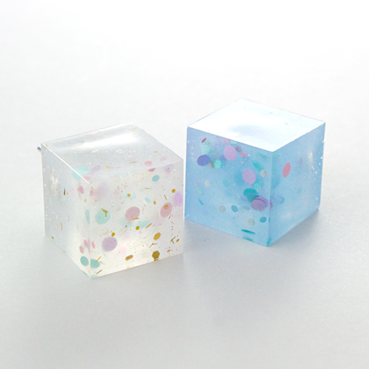 温度で色の変わるカラーを使用したカラーと丸ラメをクリスタルレジンで閉じ込めたキューブ型のピアスです。