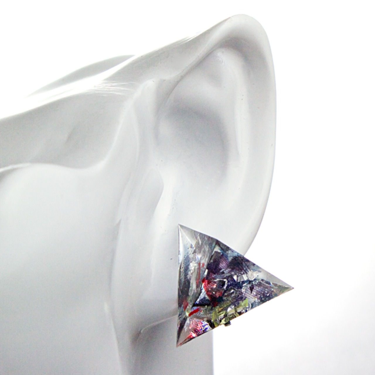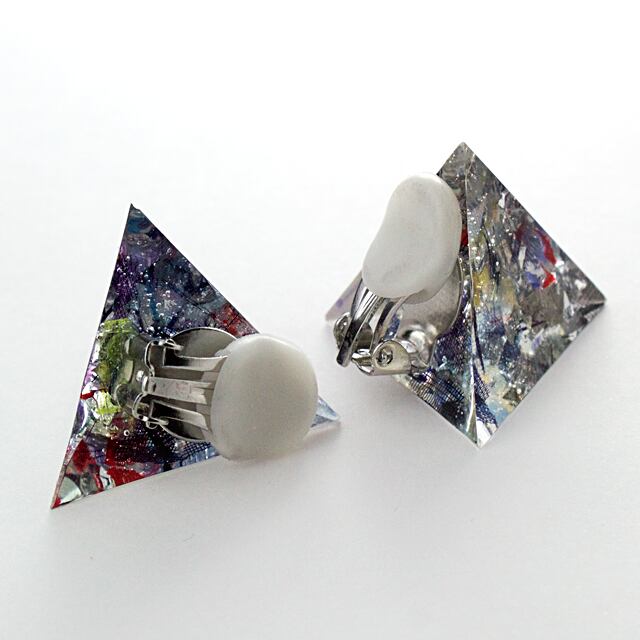 ラメとリボンの破片をクリスタルレジンで閉じ込めた三角錐型のイヤリングです。
