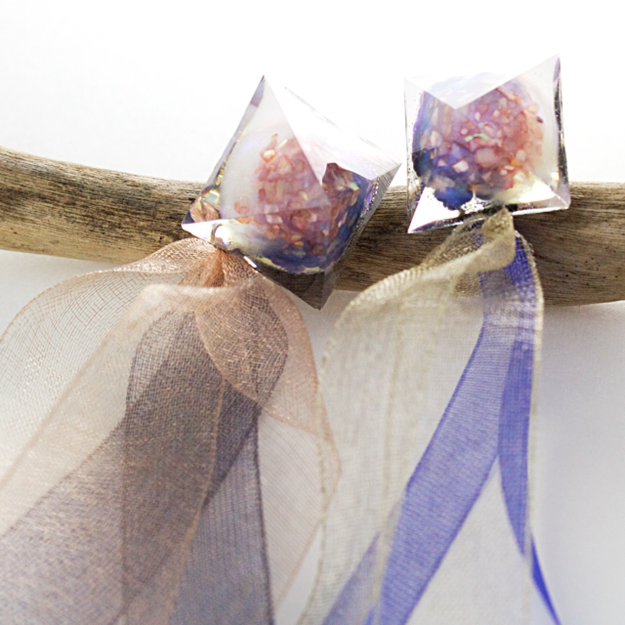 ピラミッド内にドーム状のシェルやカラーをクリスタルレジンで閉じ込めたピラミッドピアスです。