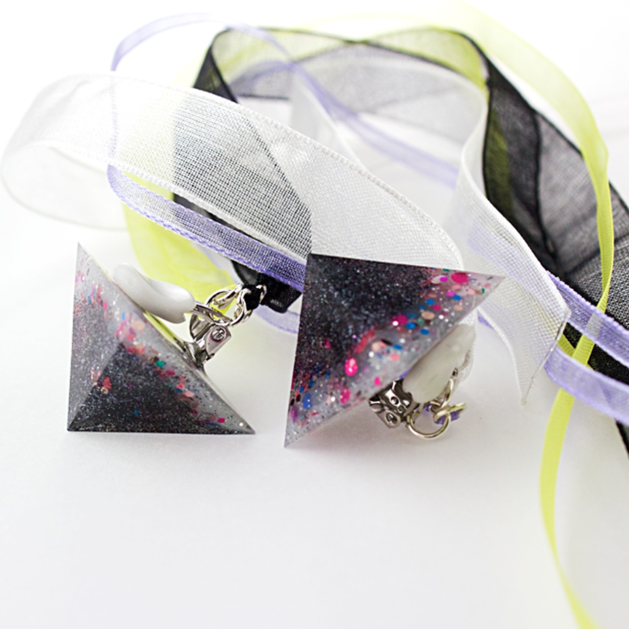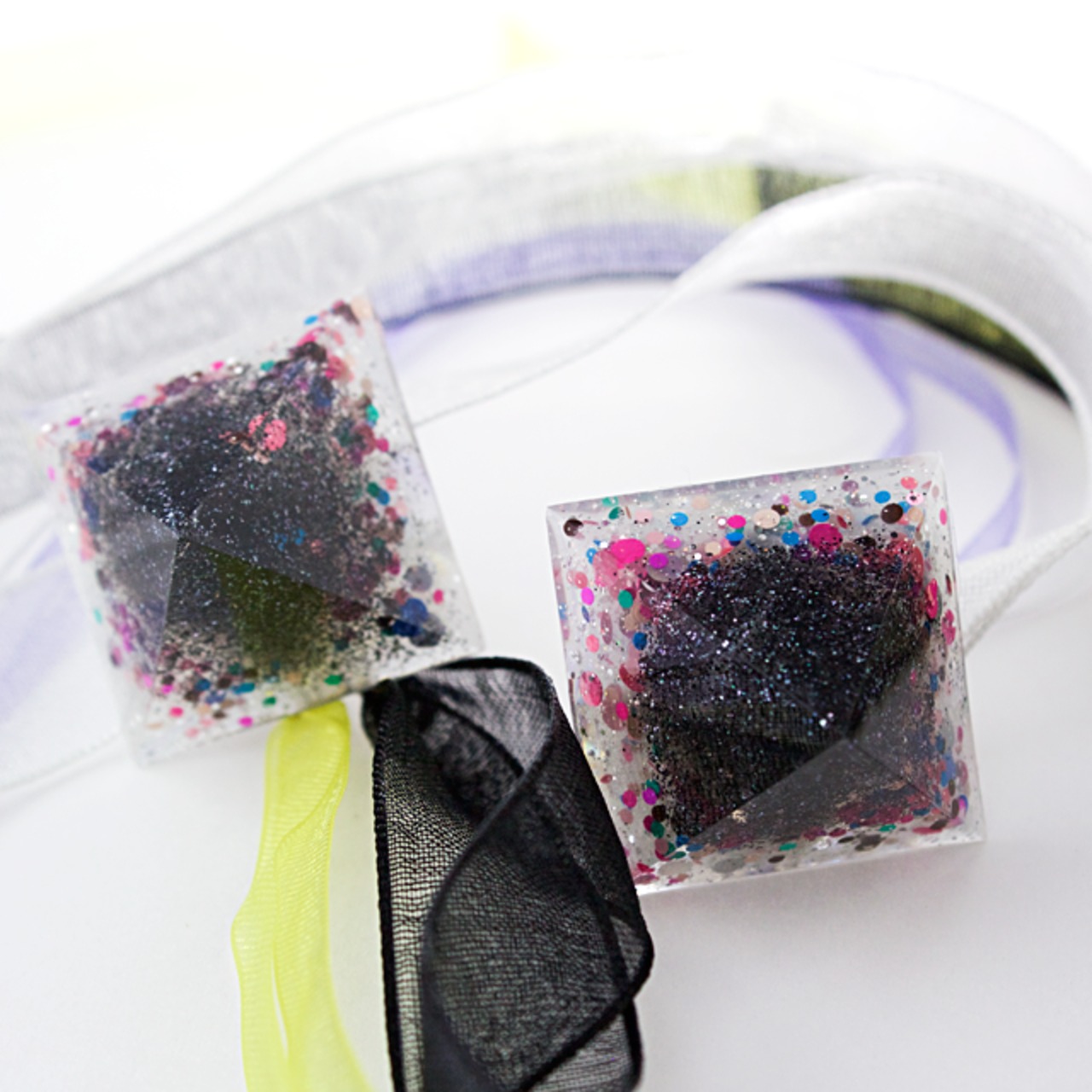 ピラミッド内に輝くブラックのカラーや、カラフルな丸ラメなどをクリスタルレジンで閉じ込めたピラミッドイヤリングです。
