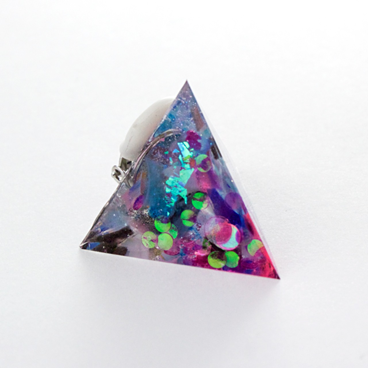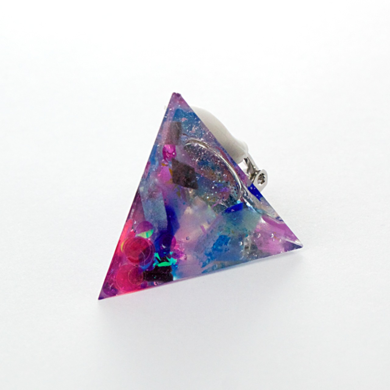 丸ラメ、乱切りホロ、様々なカラーの破片などをクリスタルレジンで閉じ込めた三角錐型のイヤリングです。