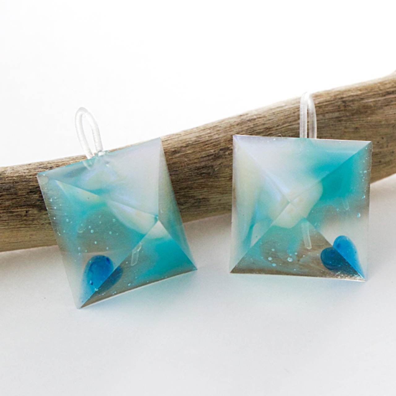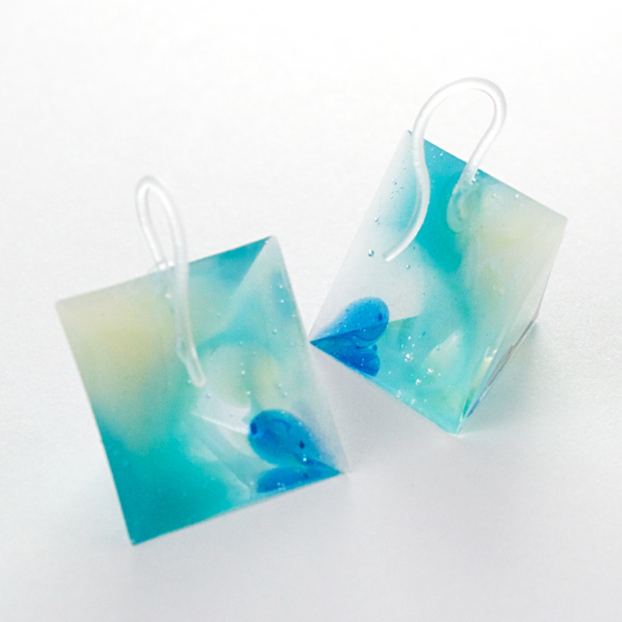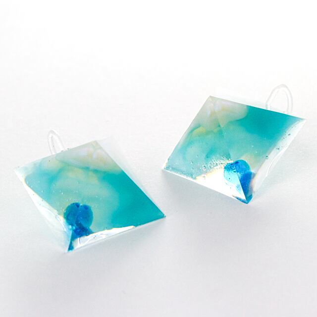 偏光ホワイト、ブルー、ライトブルーをクリスタルレジンを用いて閉じ込めたピラミッド型のフックピアスです。