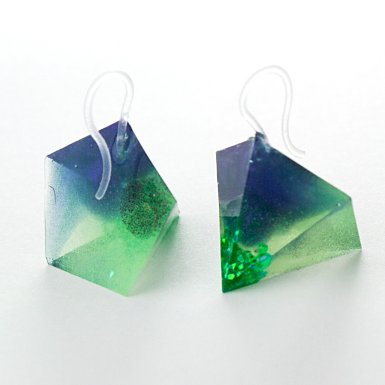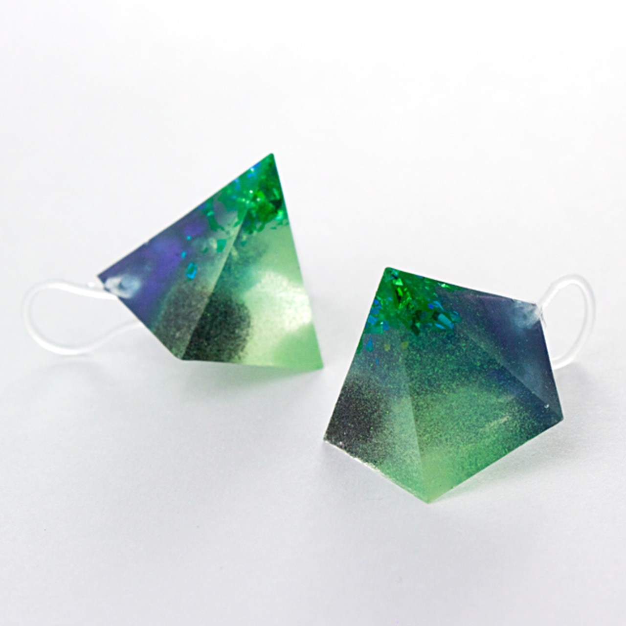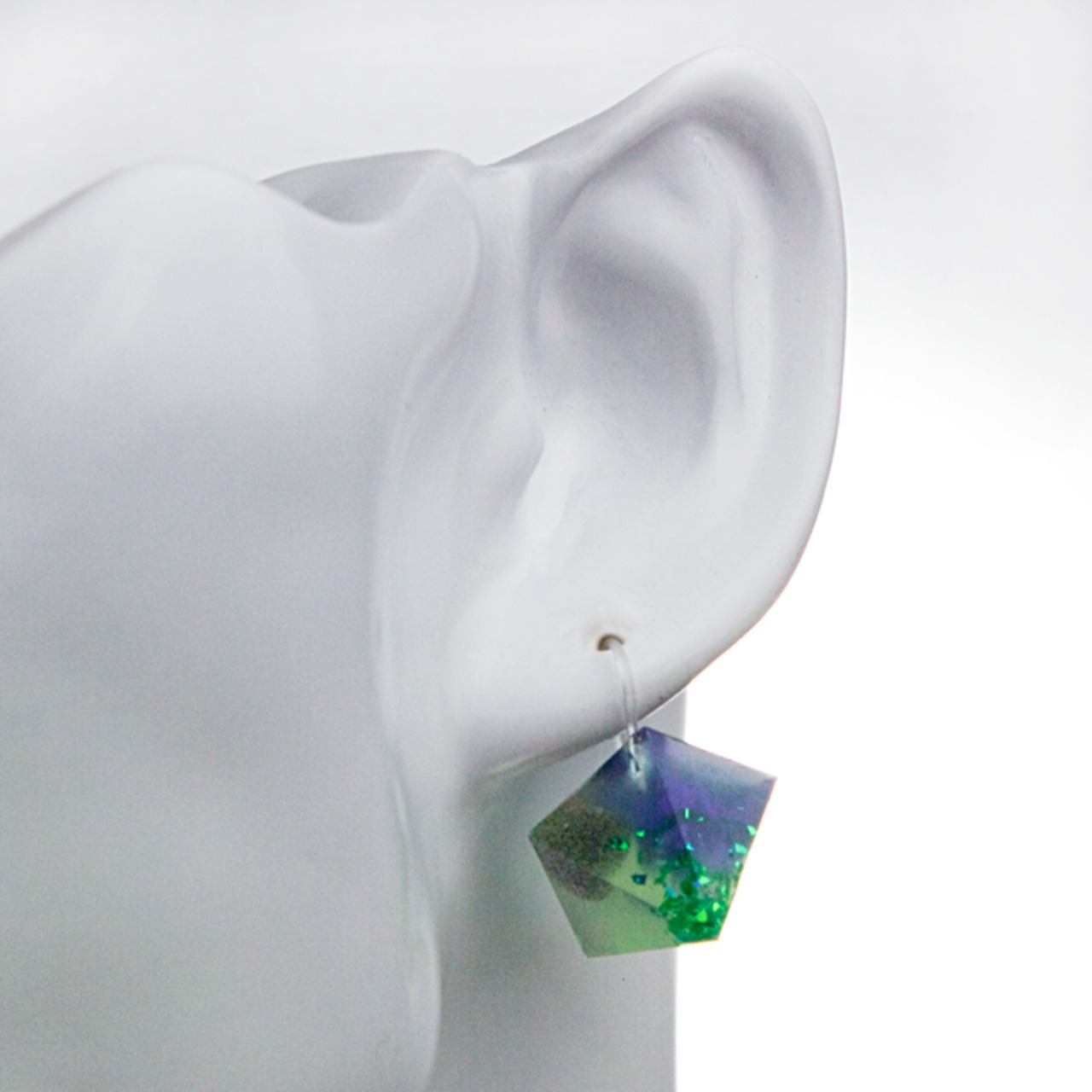 偏光パープル、グリーン、ブラックのカラーと先端にグリーンのホロをクリスタルレジンで閉じ込めたペンタゴン型のピアスです。