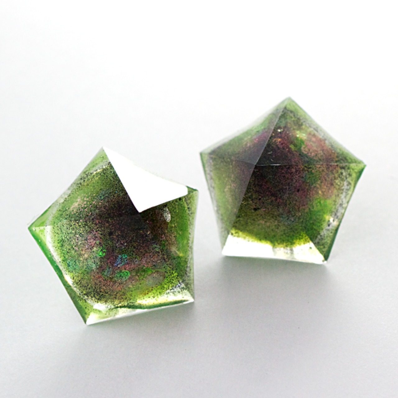ドーム型に様々な色のラメやビジューなどをクリスタルレジンで閉じ込めたペンタゴン型のピアスです。