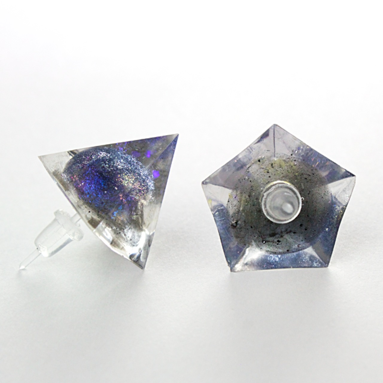 ドーム型にパープルの偏光カラーやラメなどをクリスタルレジンで閉じ込めたペンタゴン型のピアスです。