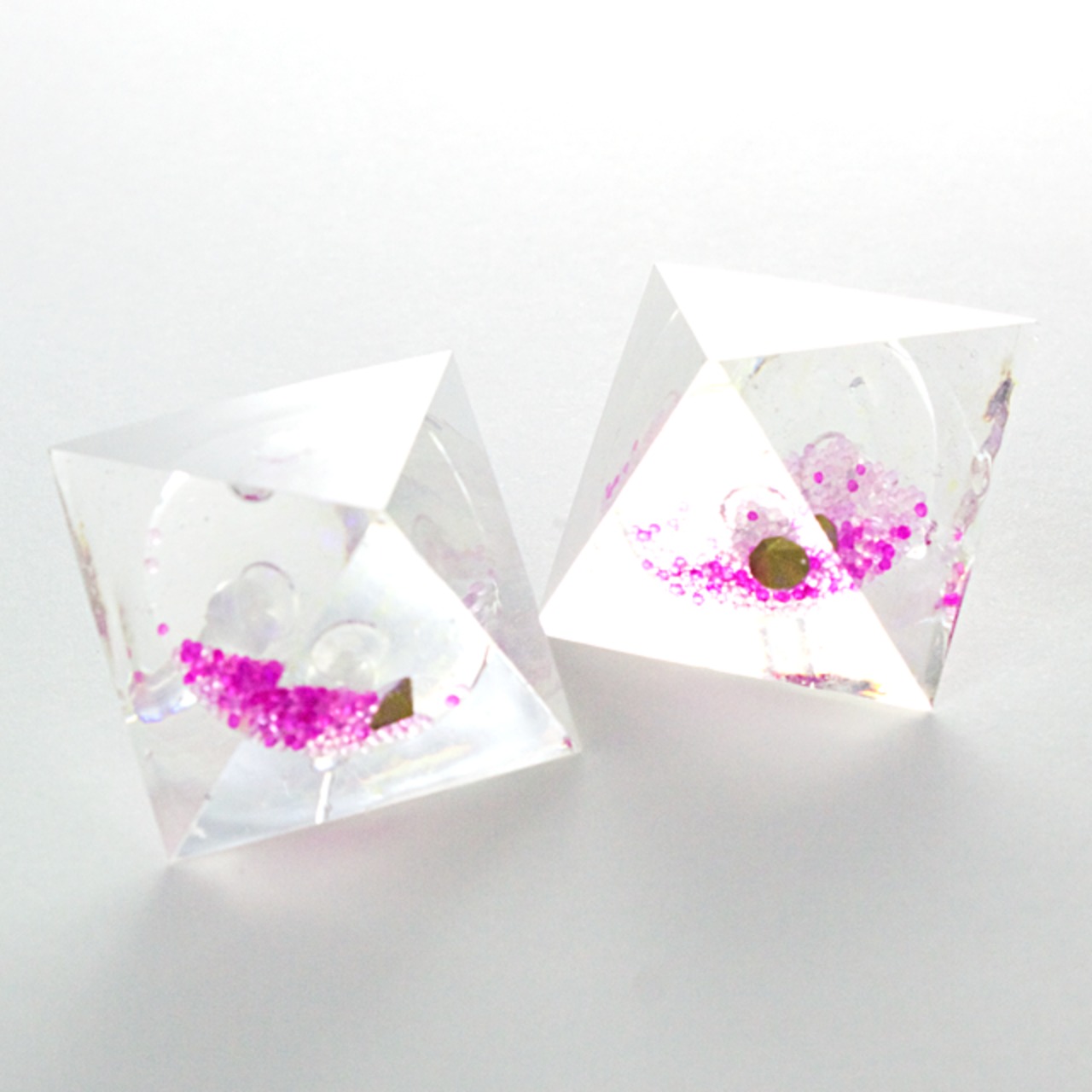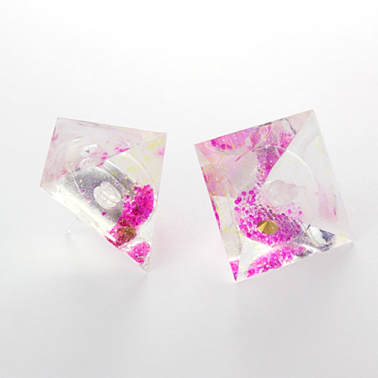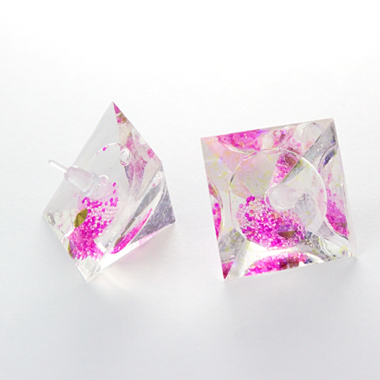 ピラミッドの中をドーム状に空洞にし、そこに液体と小さなピンクのブリオンやビジューを閉じ込めたピラミッド型のピアスです。振ったり、回したりすると内容物が水中でゆっくりと浮遊し、いろんな表情を見せてくれます!
