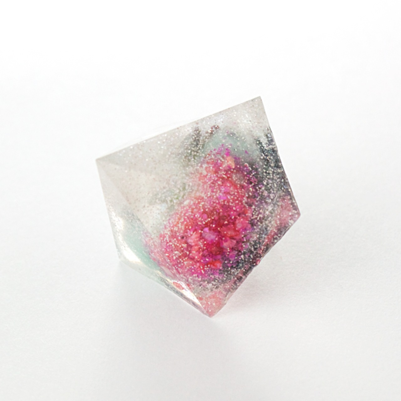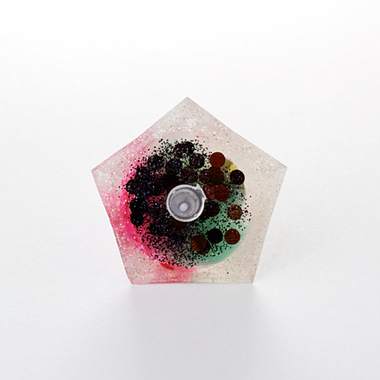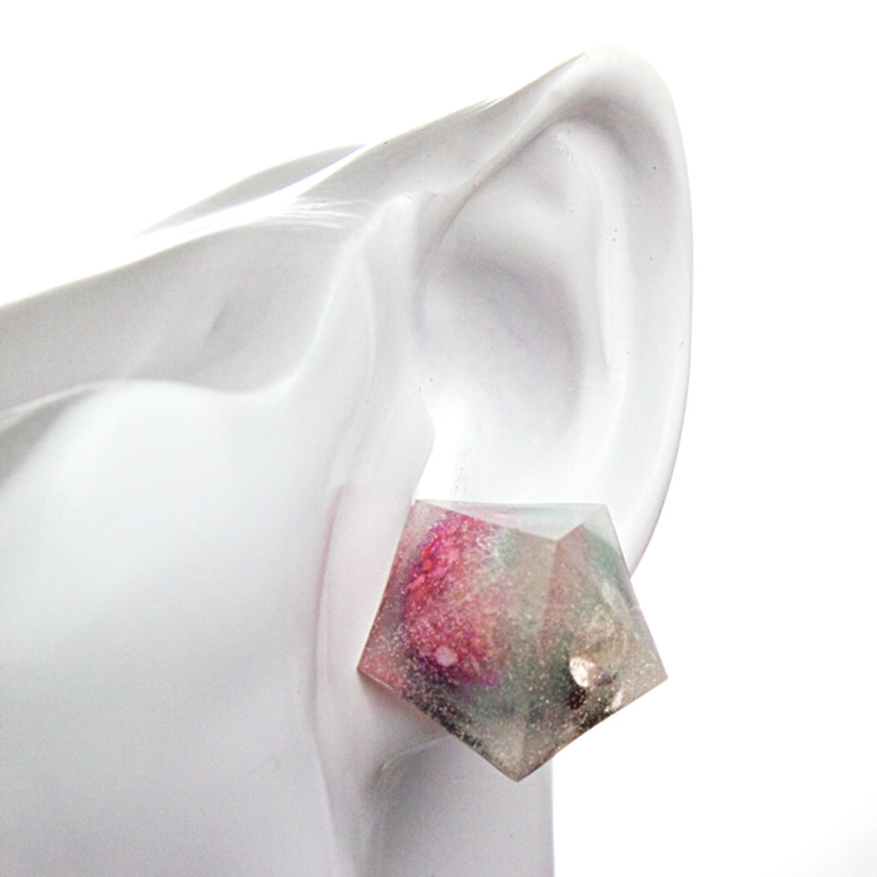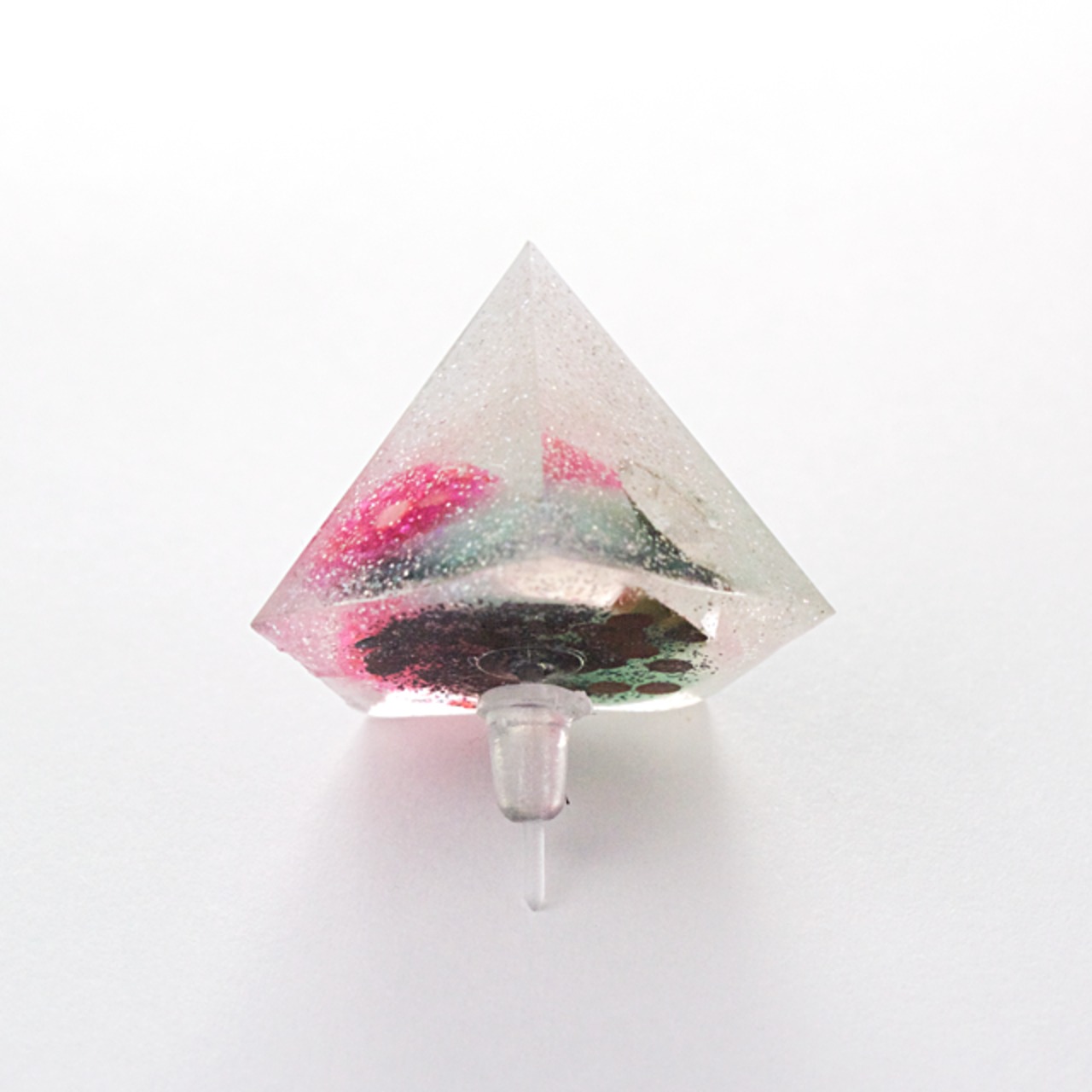 ドーム型に様々なカラーやラメ、偏光パウダーなどをクリスタルレジンで閉じ込めたペンタゴン型のシングルピアスです。