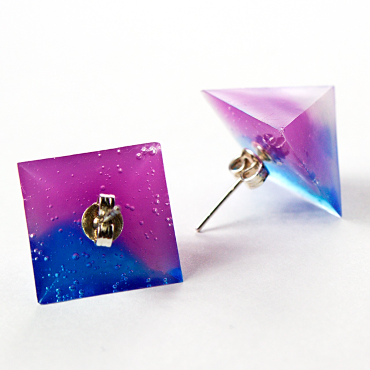 温度で色の変わるカラーを使用したカラーと偏光パウダーをクリスタルレジンで閉じ込めたピラミッドピアスです。