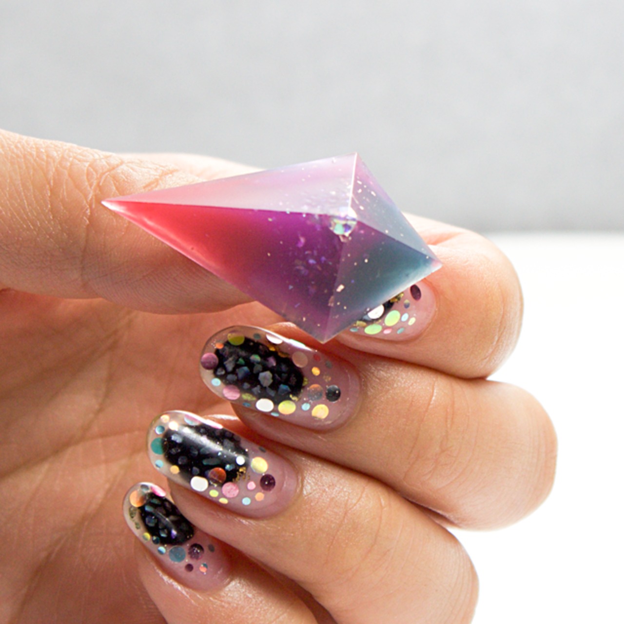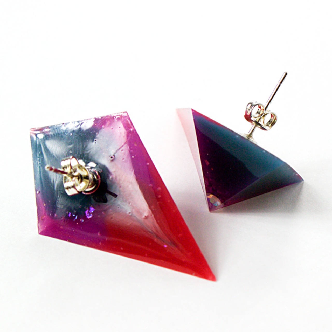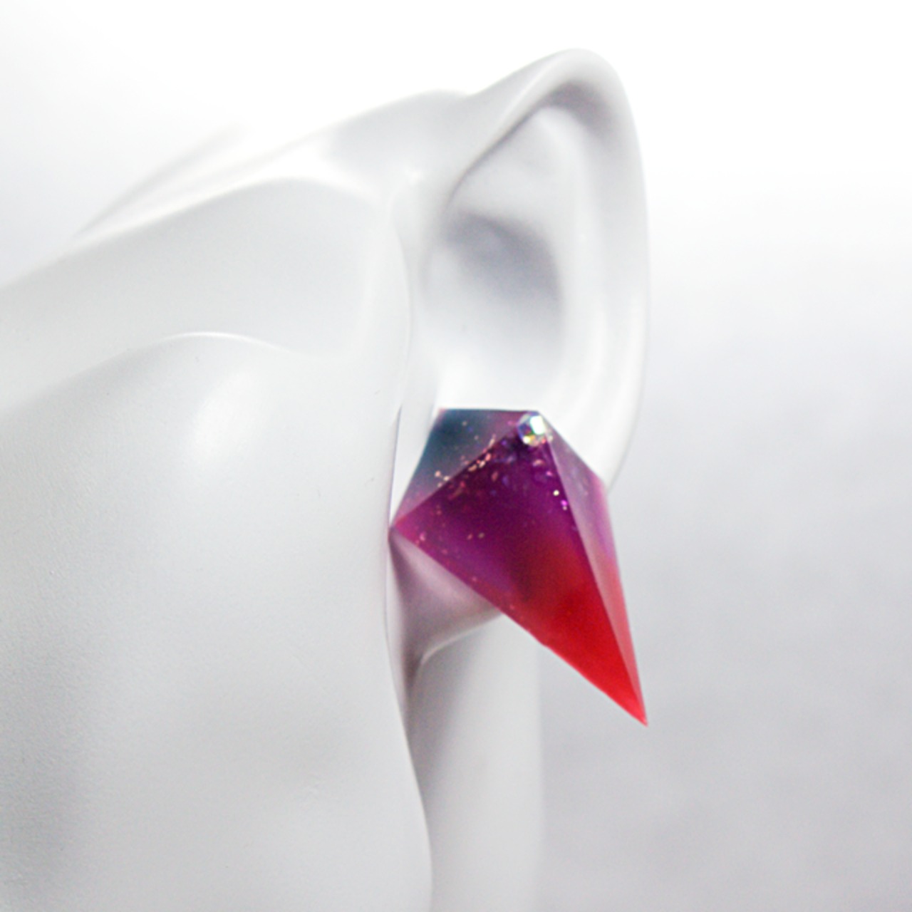 温度で色の変わるカラーと、先端にビジュー、ゴールドのラメをクリスタルレジンで閉じ込めたピラミッドピアスです。