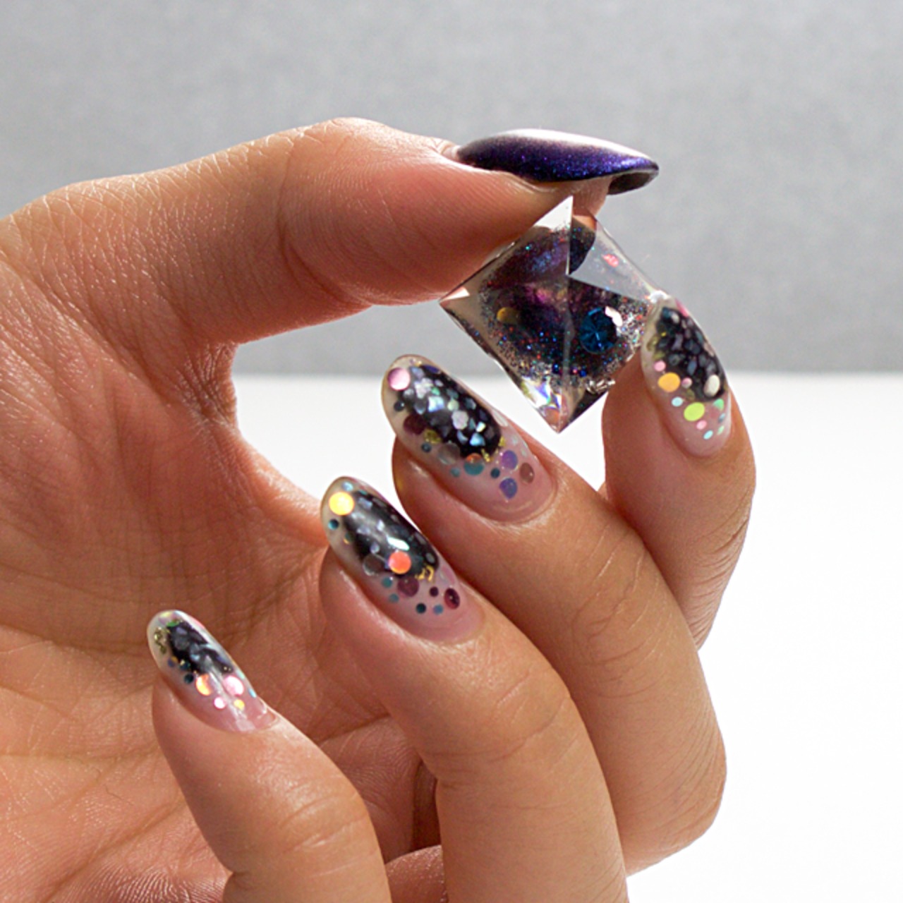 ピラミッド内に様々なカラーとラメ、ブルーのビジューをクリスタルレジンで閉じ込めたドームをさらに閉じ込めたピラミッドイヤリングです。