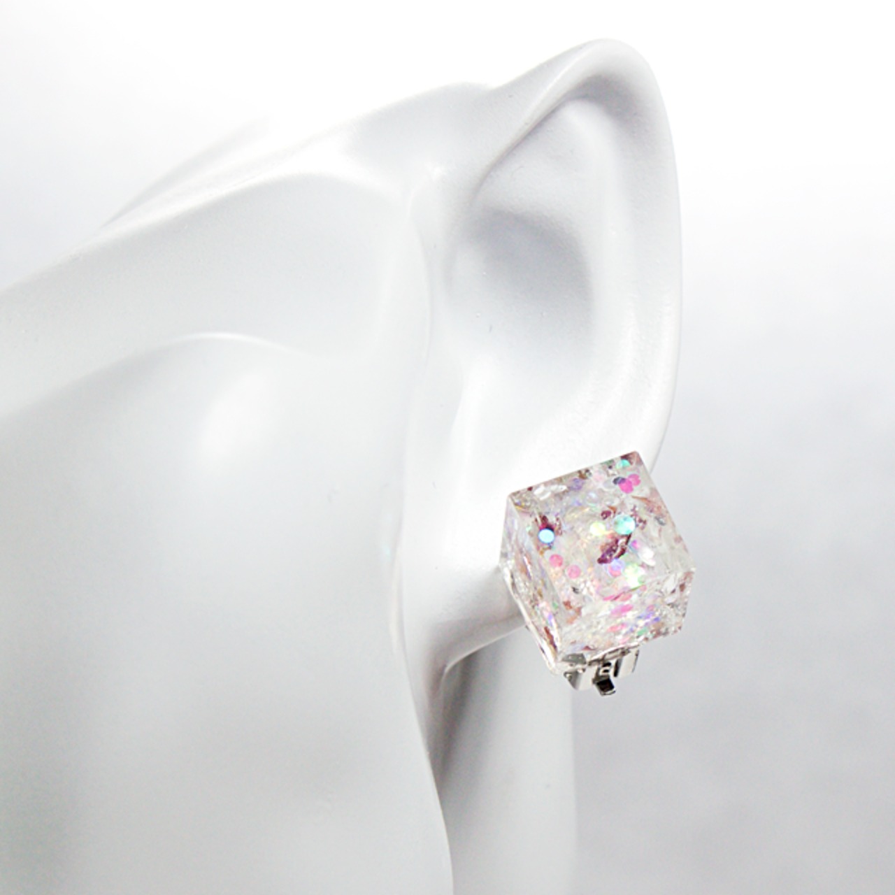 ドライフラワーや丸ラメなどをクリスタルレジンで閉じ込めたを用いたキューブ型のクリップタイプのイヤリングです。