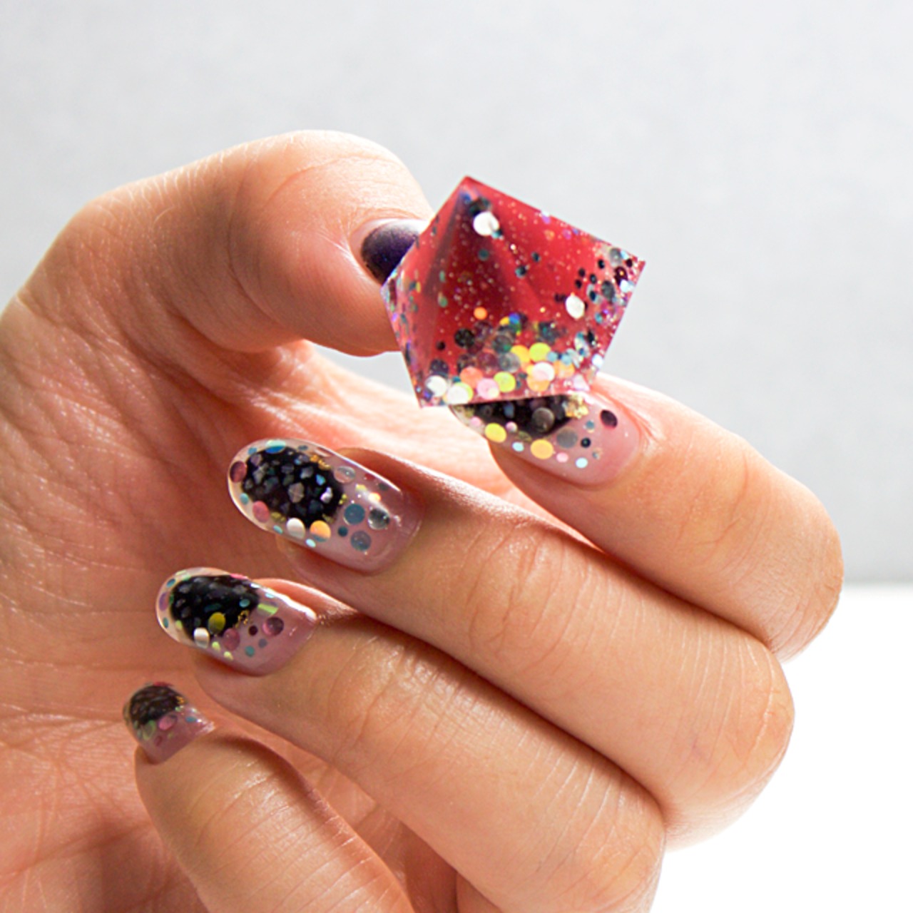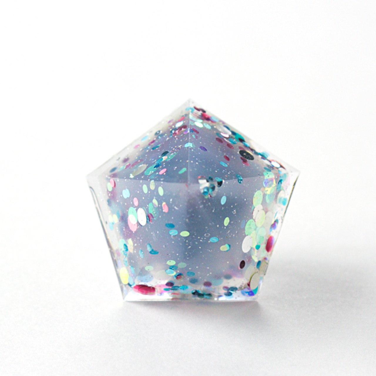 温度で色の変わるカラーやラメなどをクリスタルレジンで閉じ込めたペンタゴン型のシングルイヤリングです。