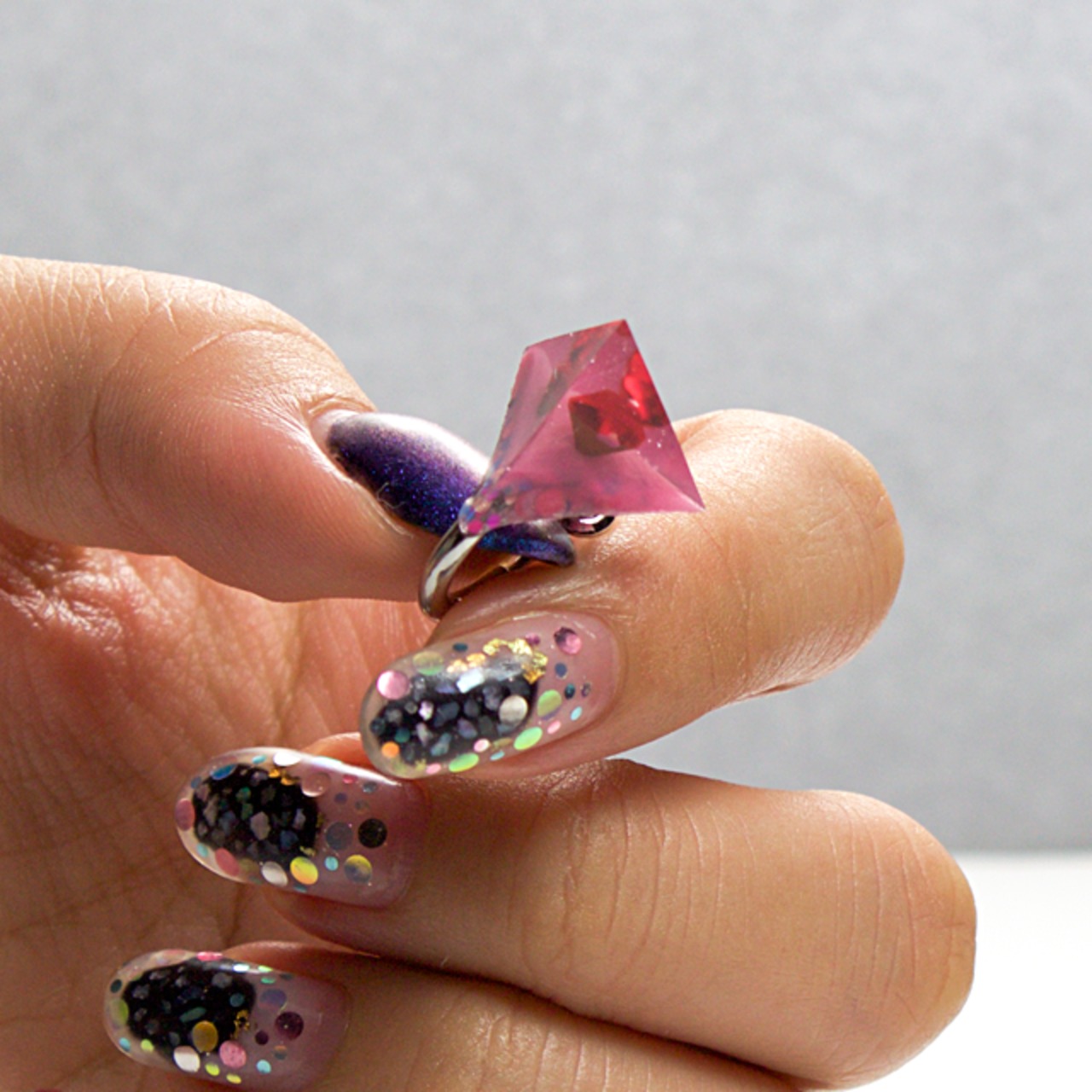 ピンクカラーとカラフルラメ、レッドの大きめビジューをクリスタルレジンで閉じ込めたトライアングル型のイヤリングです。