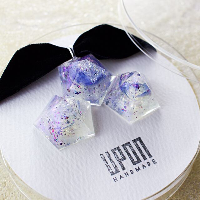 偏光性のラメフレーク、パウダー、自家製ドライフラワーの紫陽花をクリスタルレジンで閉じ込めた