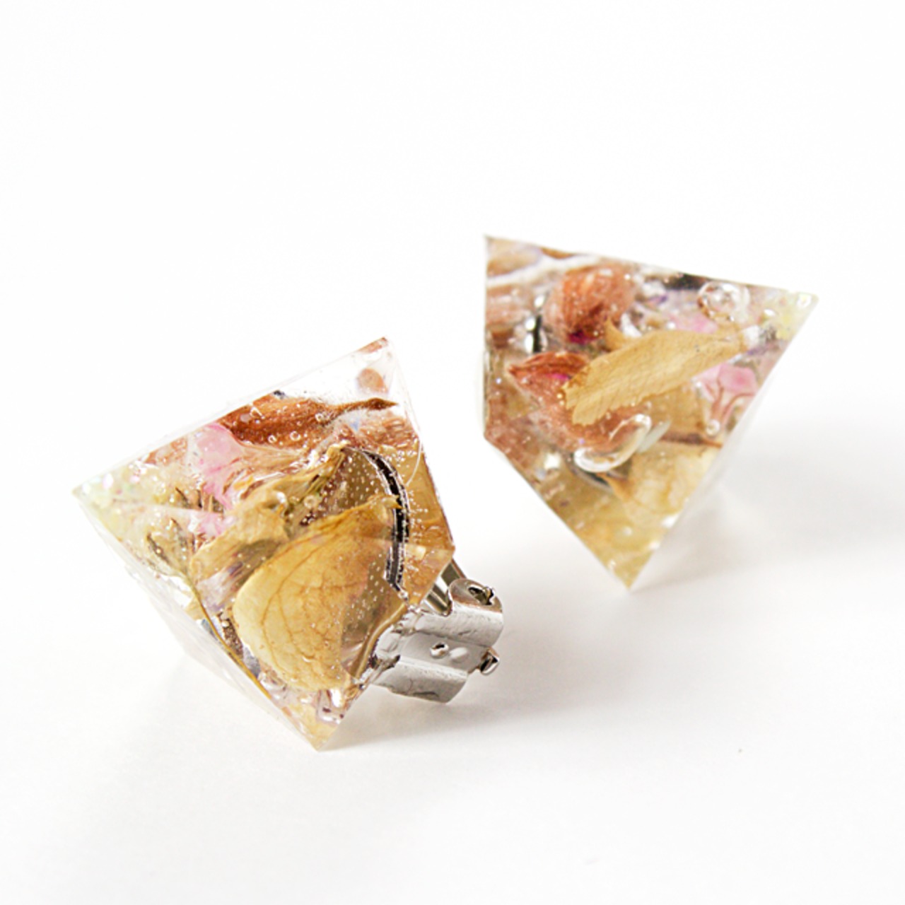 様々な種類の自家製ドライフラワーを沢山クリスタルレジンで閉じ込めたピラミッドイヤリングです。