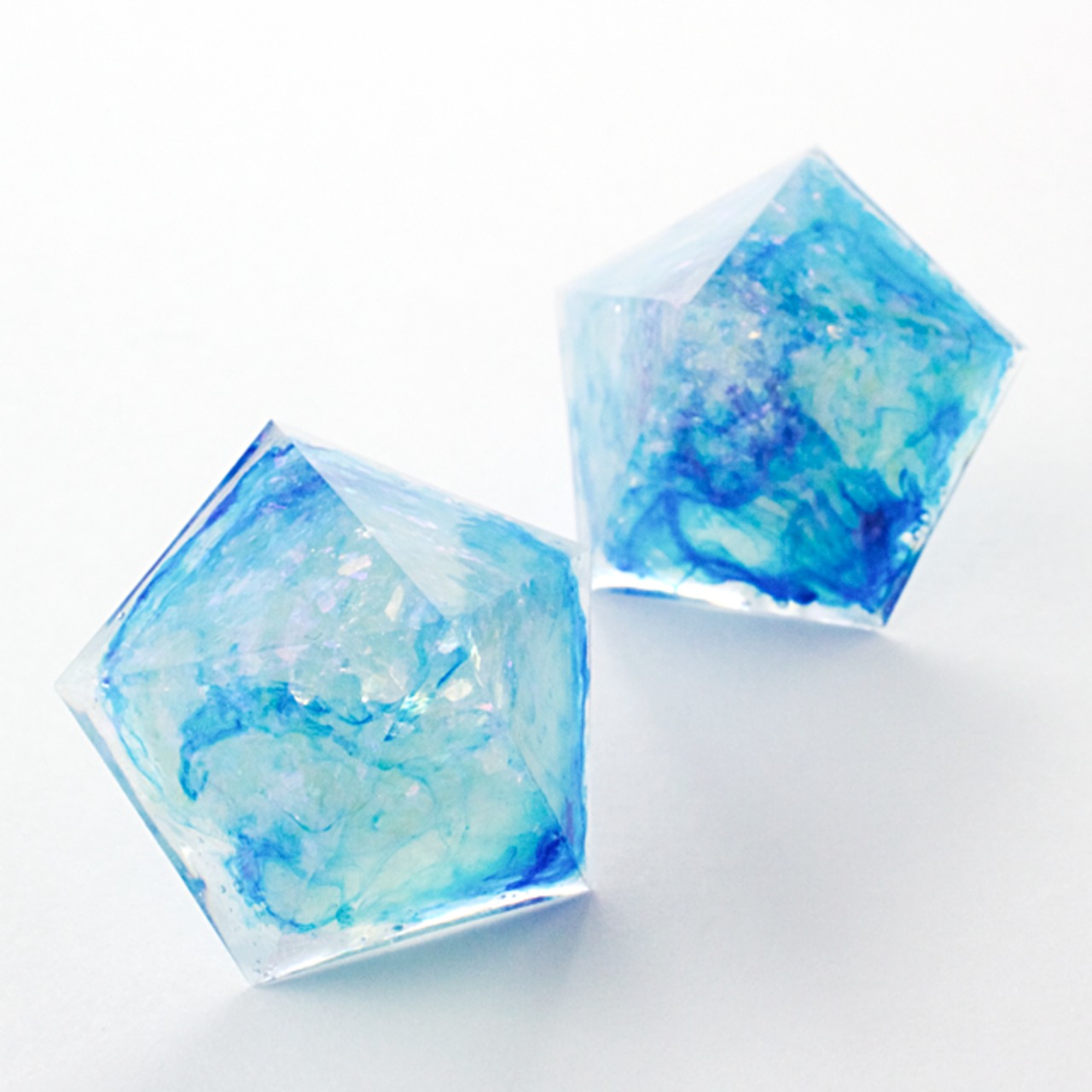 様々なラメとブルーカラーをクリスタルレジンで閉じ込めたペンタゴン型のピアスです。
