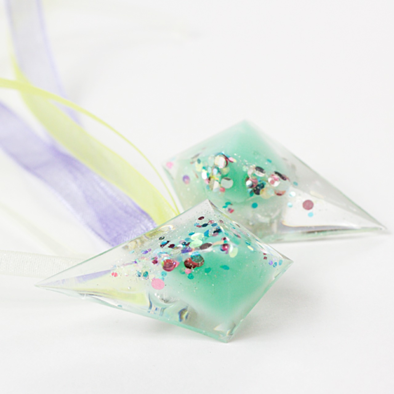 鋭角ピラミッド内にミントカラーや丸ラメを始めとする様々なラメなどをクリスタルレジンで閉じ込めたピラミッドイヤリングです。