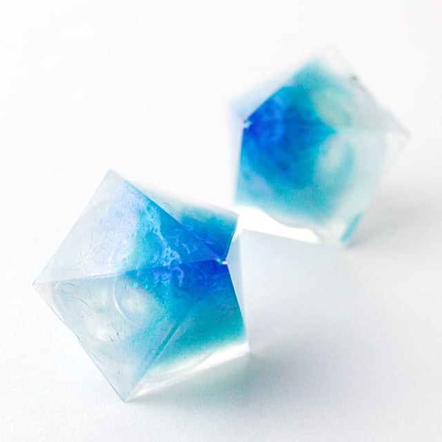 先端に濃いブルー、その他に偏光のブルーをクリスタルレジンで閉じ込めたペンタゴン型のピアスです。