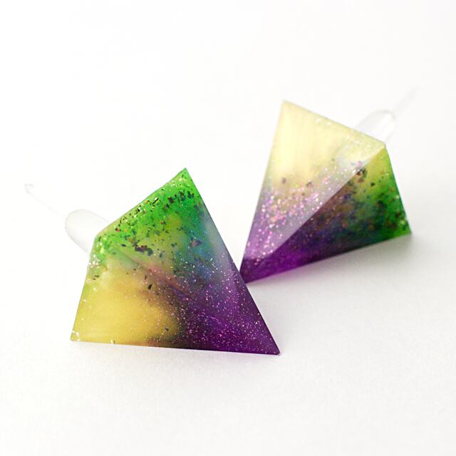 パープル、イエロー、グリーンのカラーとラメなどを閉じ込めたクリスタルレジンのピラミッド型のピアスです。