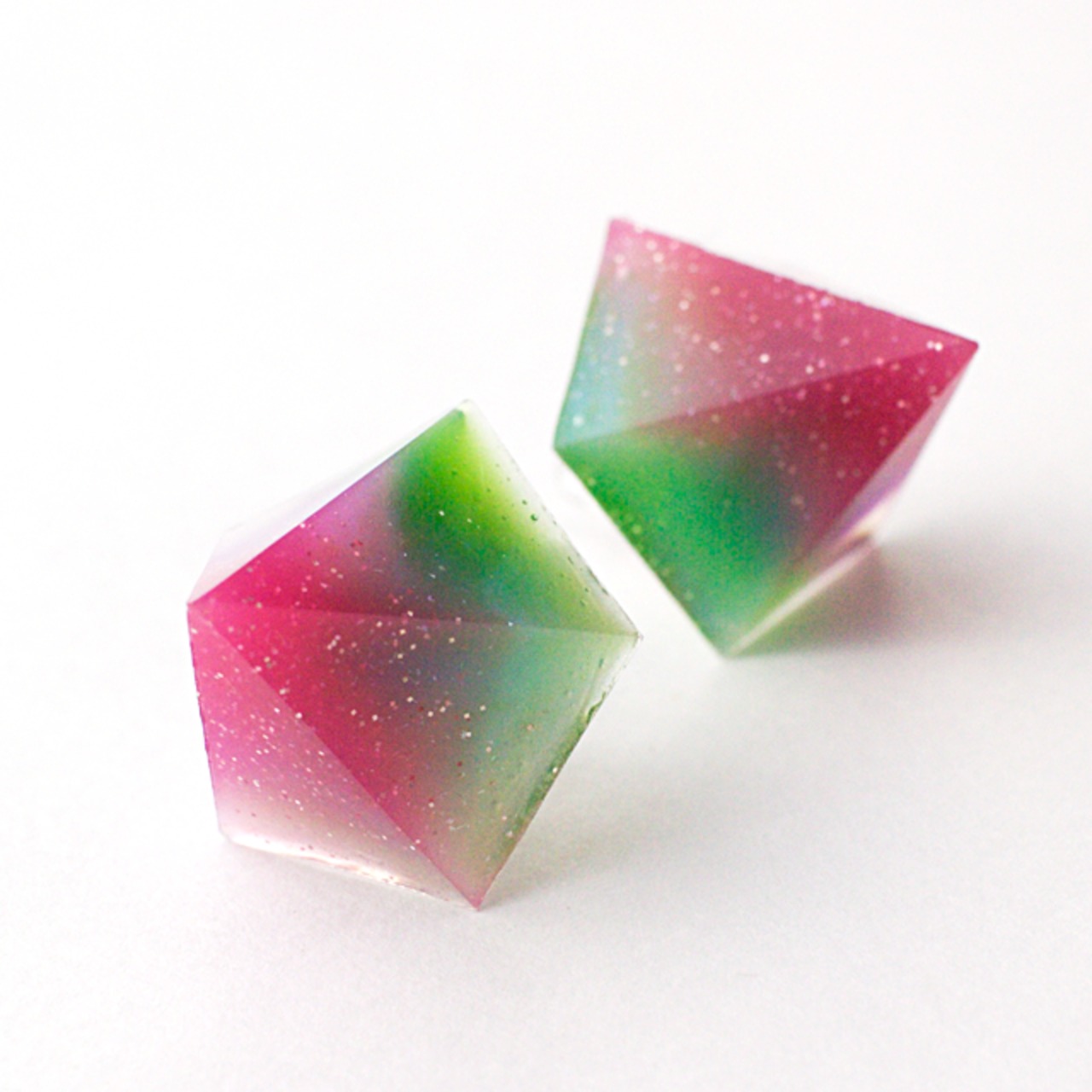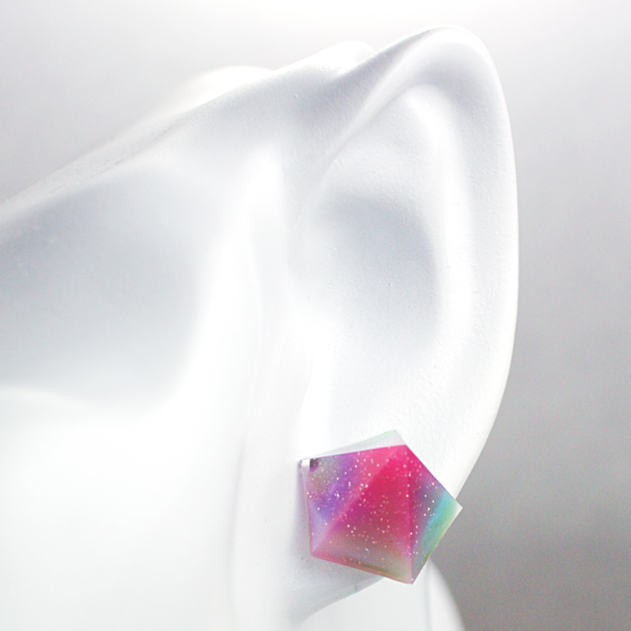グリーン、ピンク、パープルの偏光カラーなどをクリスタルレジンでクリスタルレジンで閉じ込めたペンタゴン型のピアスです。