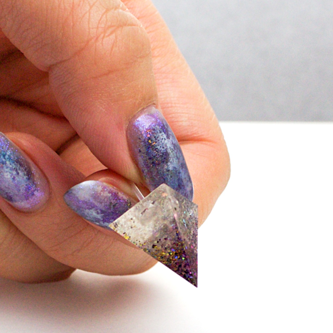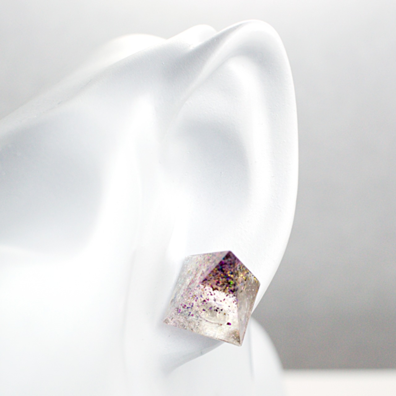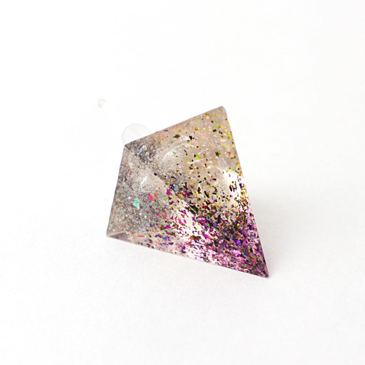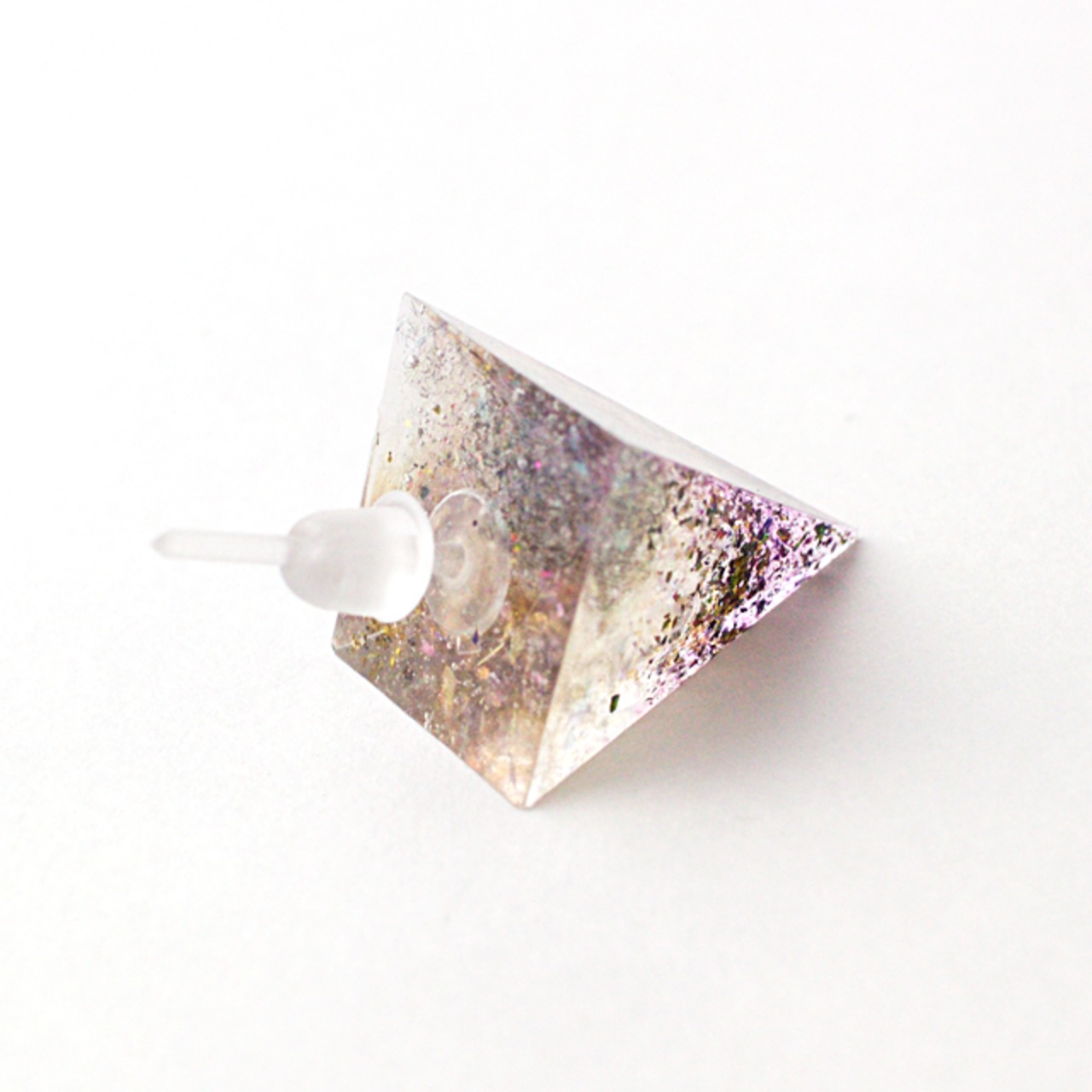様々なカラーのラメなどを閉じ込めたクリスタルレジンのピラミッド型のピアスです。