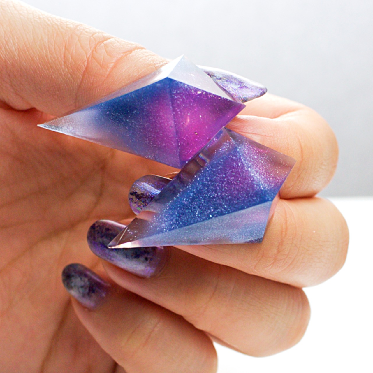 温度で色の変わるカラーと、一部分変わらないカラーをクリスタルレジンで閉じ込めた鋭角ピラミッドイヤリングです。