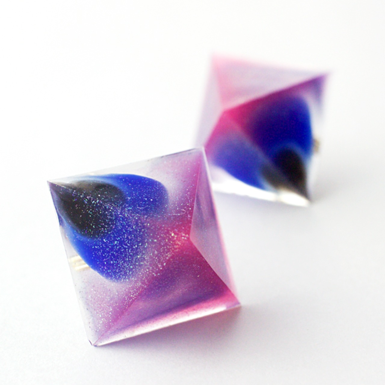 温度で色の変わるカラーと一部分変わらないカラー、偏光のラメなどをクリスタルレジンで閉じ込めたピラミッドピアスです。