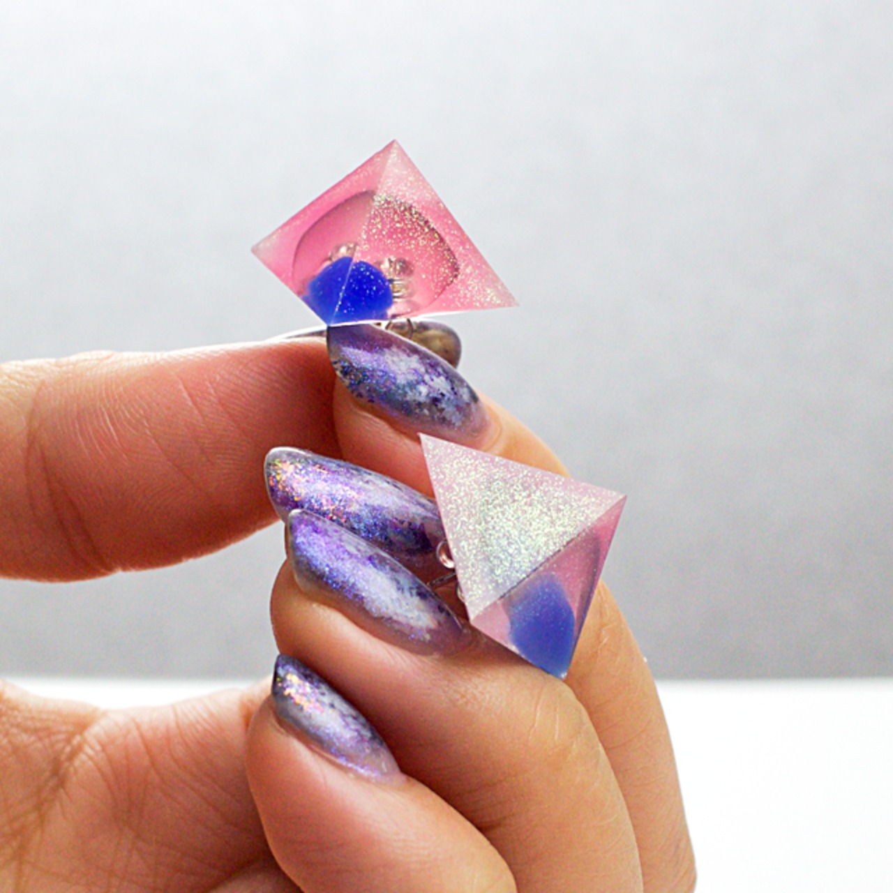 温度で色の変わるカラーと一部分変わらないカラー、偏光のラメなどをクリスタルレジンで閉じ込めたピラミッドピアスです。
