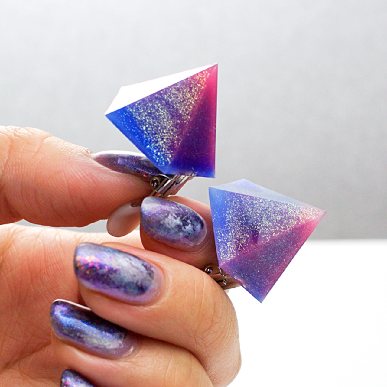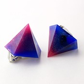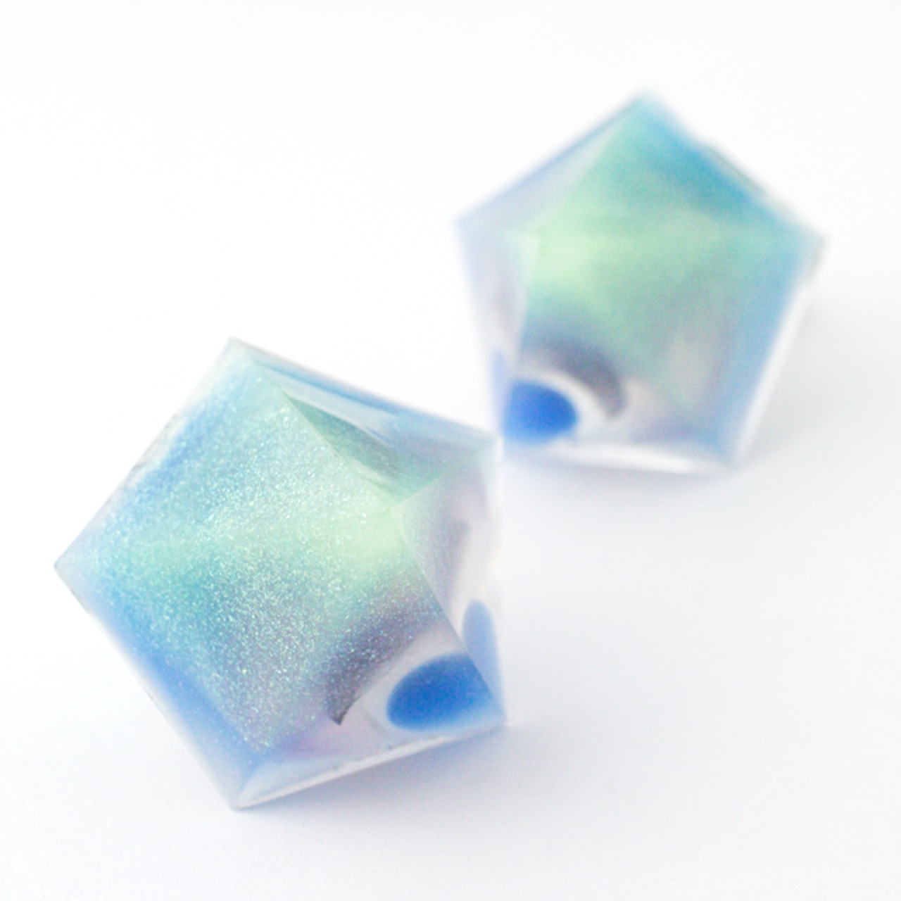 温度で色の変わるカラーと一部変わらないカラー、細かなラメなどをクリスタルレジンで閉じ込めたペンタゴンサーモイヤリングです。