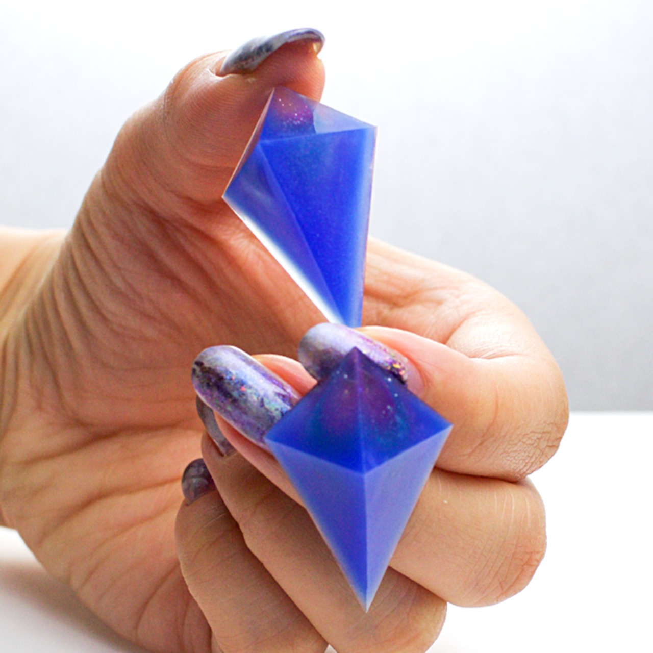 温度で色の変わるカラーと、一部分変わらないカラーをクリスタルレジンで閉じ込めた鋭角ピラミッドイヤリングです。