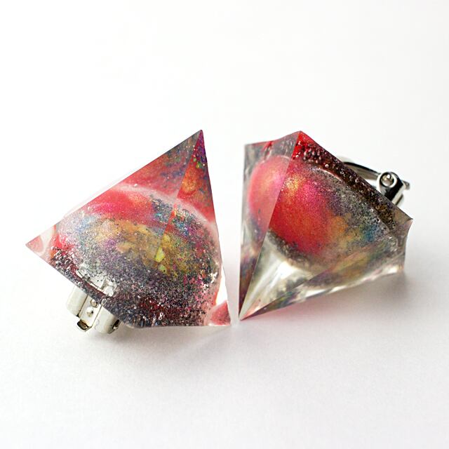 ドーム型にレッドやピンクパープル系の様々なカラーや偏光カラーなどをクリスタルレジンで閉じ込めたペンタゴン型のイヤリングです。