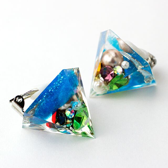 様々なビジューやパールストーンとブルーカラーをクリスタルレジンで閉じ込めたペンタゴン型のイヤリングです。