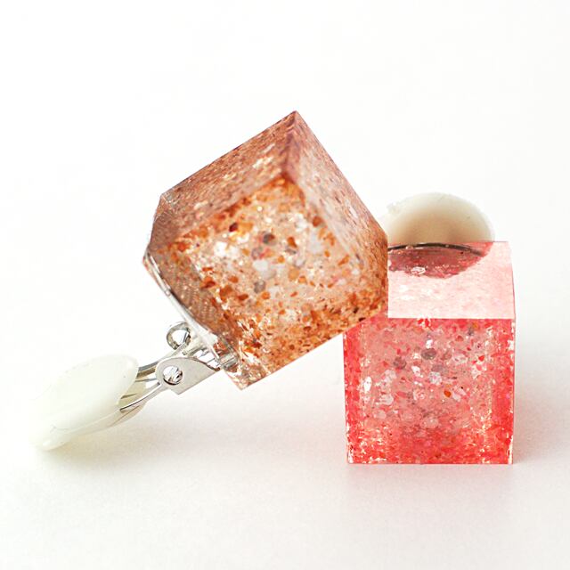 ラメやシェルなどをふんだんにクリスタルレジンで閉じ込めたキューブ型のクリップタイプのイヤリングです。