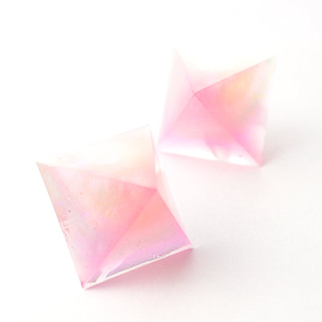 ピンクとホワイトの蓄光カラーと偏光ラメをクリスタルレジンで閉じ込めたピラミッド型のピアスです。