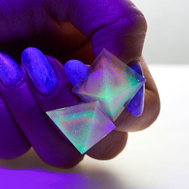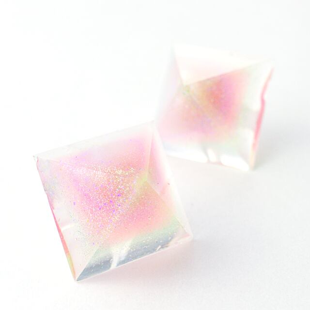 ピンクとグリーンの蓄光カラーと偏光ラメをクリスタルレジンで閉じ込めたピラミッド型のピアスです。