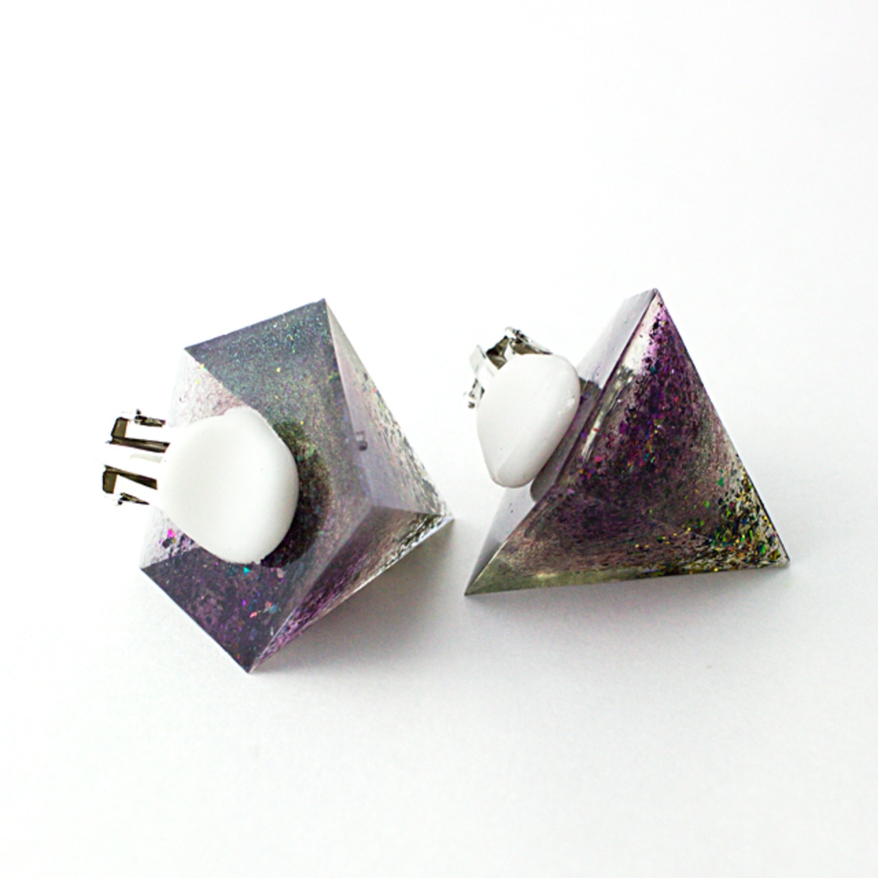 8種の偏光性のラメとパウダーを絶妙な割合で混合してクリスタルレジンで閉じ込めたペンタゴン型のイヤリングです。