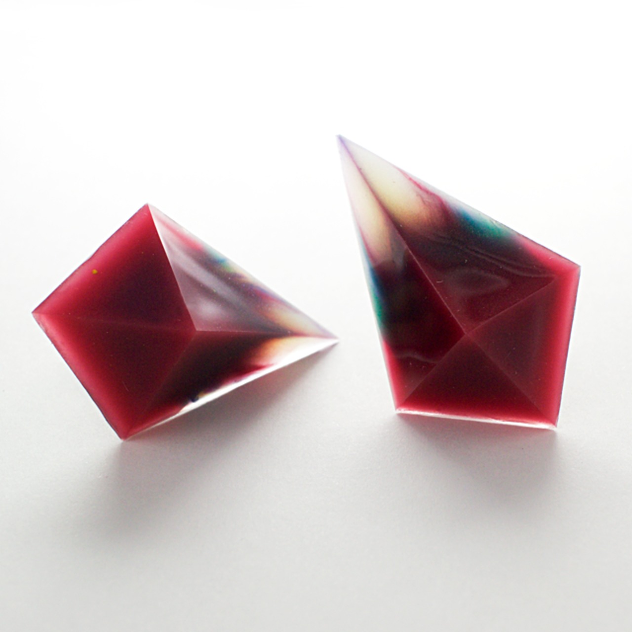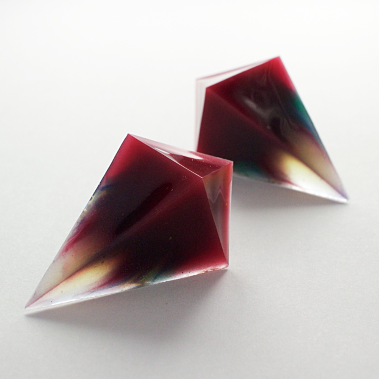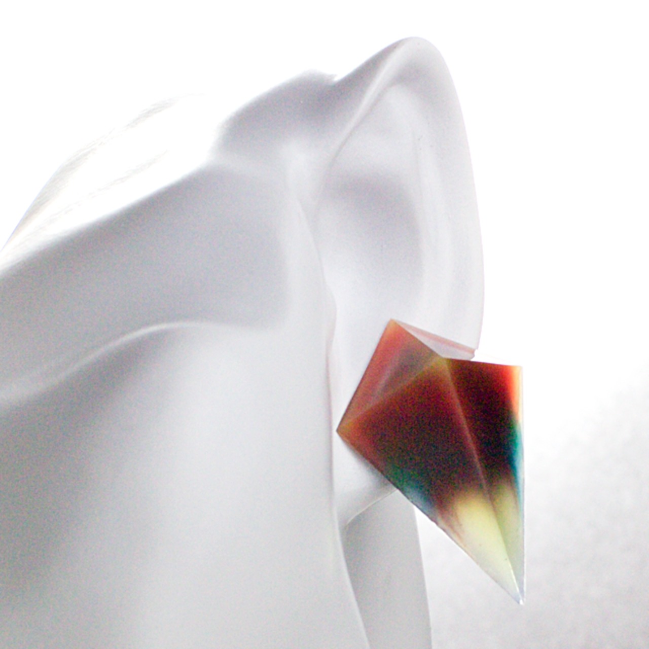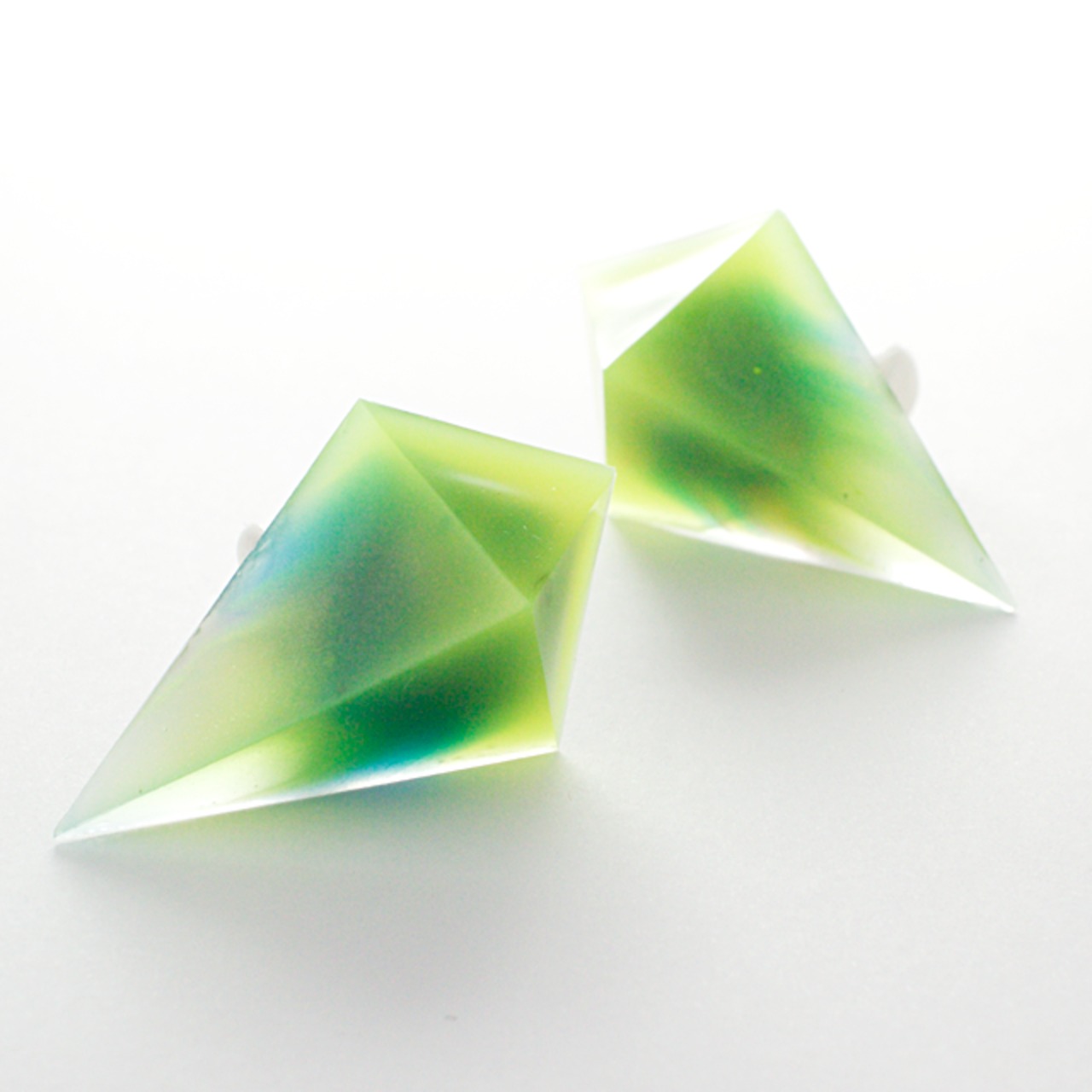温度で色の変わるカラーと、一部分変わらないカラーをクリスタルレジンで閉じ込めた鋭角ピラミッドイヤリングです。