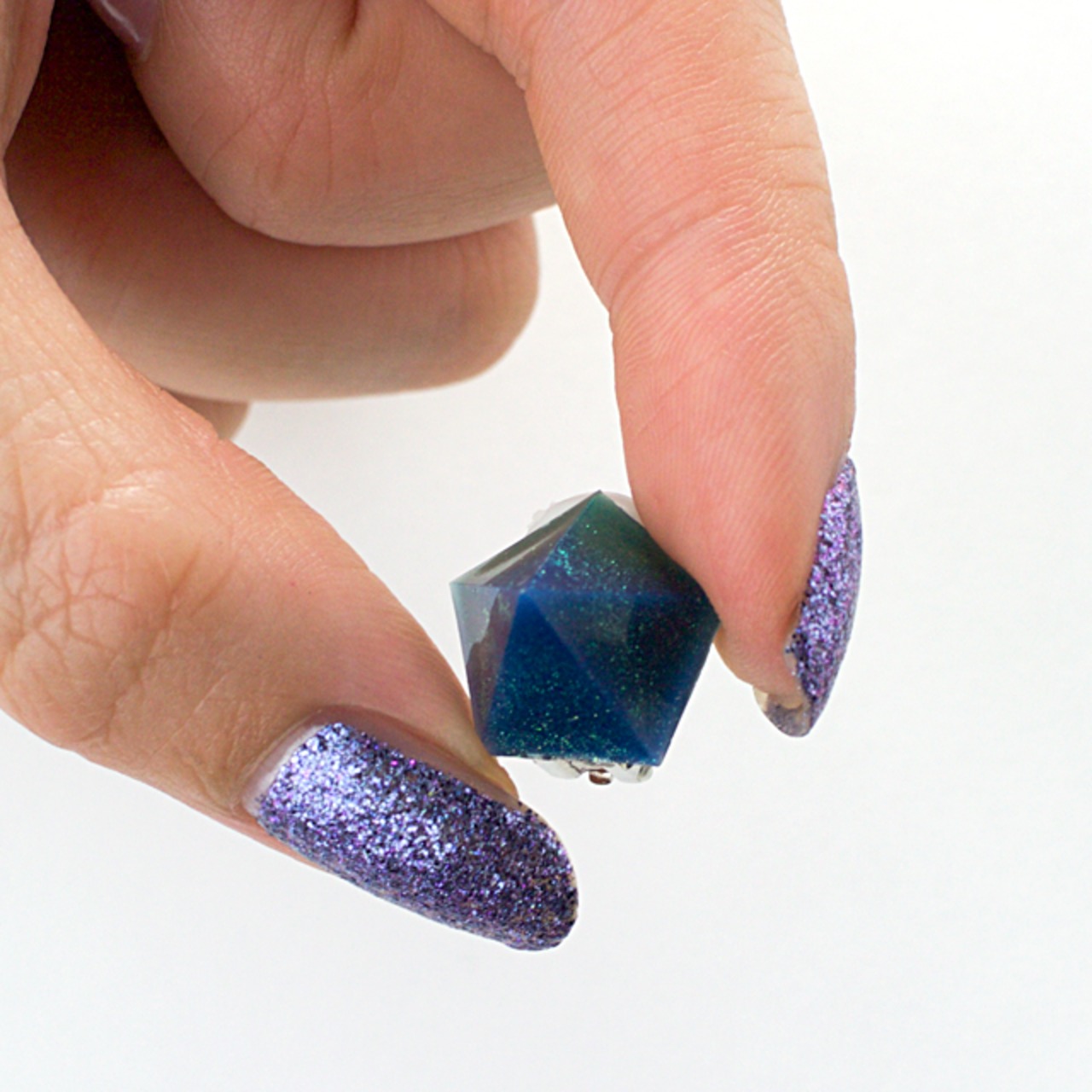 温度で色の変わるカラーと細かなラメなどをクリスタルレジンで閉じ込めたペンタゴンサーモイヤリングです。